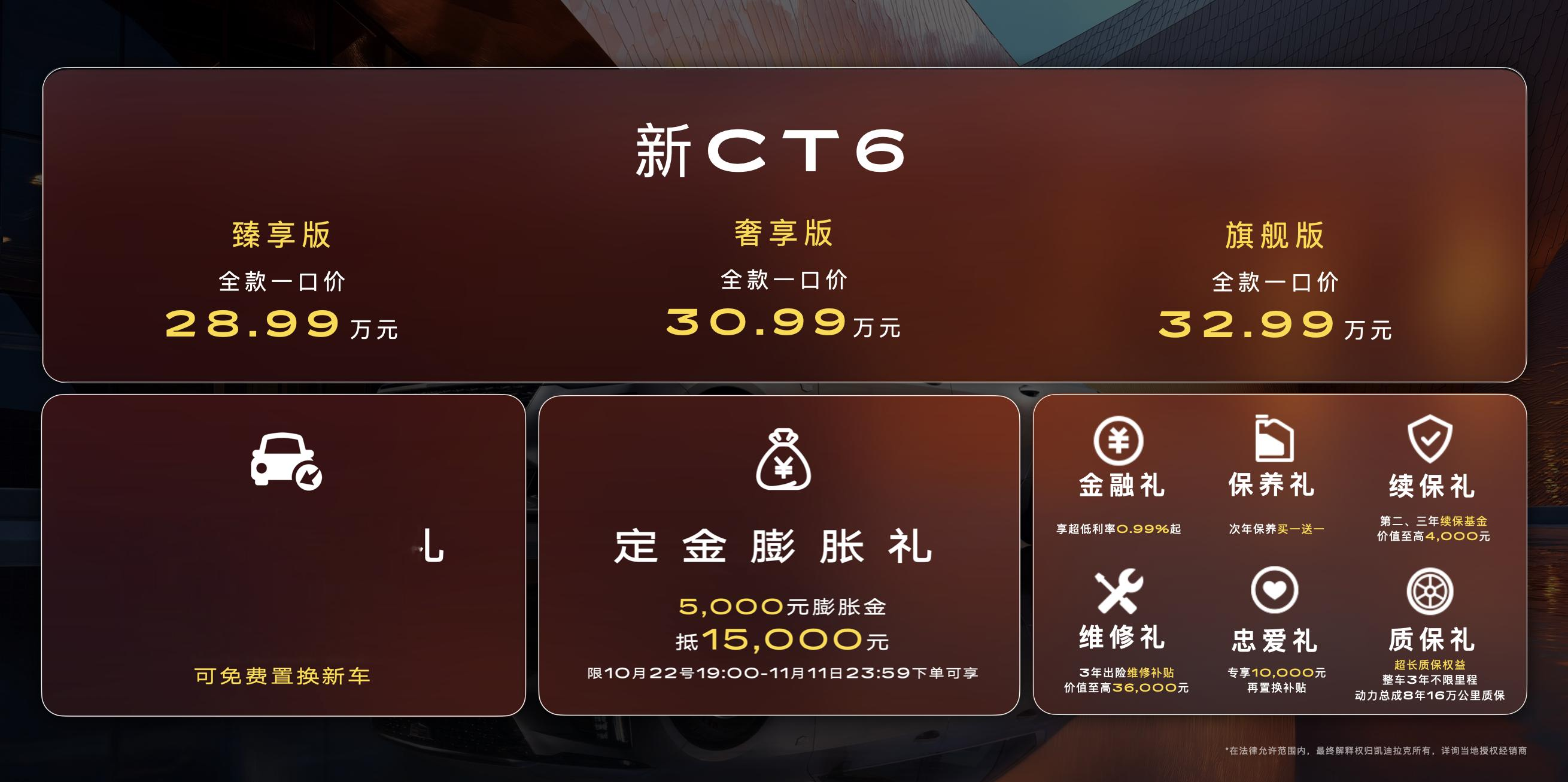 同时,新CT6重磅推出备受用户好评的“战损焕新礼”——单次车损超过购车价三成可置换等价新车,目前已有超过60位凯迪拉克车主享受该权益。不仅有未来的安心保障,凯迪拉克更带来了当下可享的诚意,即日起至“双十一”,用户可享5000元定金抵15000元购车款的限时膨胀礼遇。不仅如此,新CT6还带来了忠爱礼、续保礼、金融礼、保养礼等八大权益。凯迪拉克新CT6诞生于品牌专属旗舰豪华后驱平台,不仅搭载百万级磁浮底盘,更融合品牌先锋设计语言与极致豪华细节,为用户带来顶级驾驶乐趣与越级乘坐体验。即刻下定凯迪拉克新CT6,解锁专属百万级豪华奢享新境!