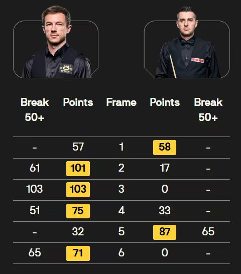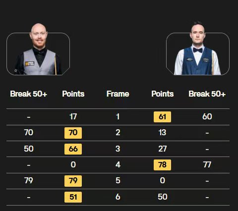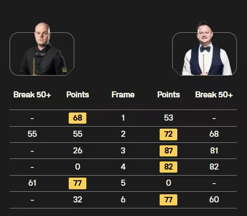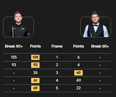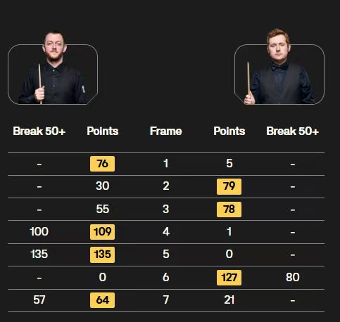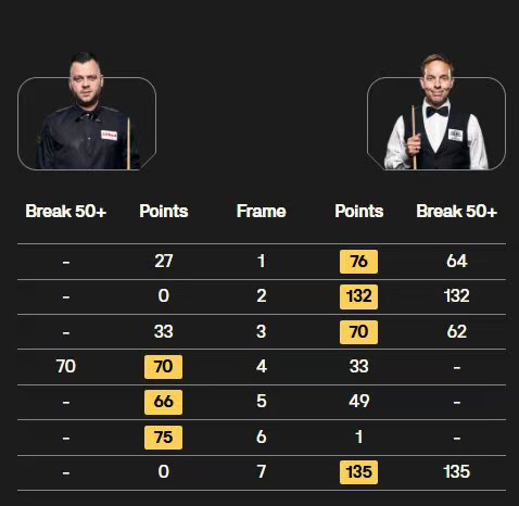 卡特轰出两杆破百(135、132分)和两杆50+,4-3险胜吉米-罗伯逊;艾伦也轰出两杆破百(100、135分),4-3险胜沃拉斯顿。