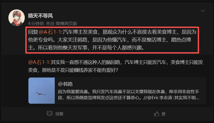 4、微博是个首先追人的平台,还是很在乎:“活人”感的,只发汽车,我账号就剩下纯工作,会大幅度降低我账号粘性。如果,你又是活人、又有内容,这个才是微博平台最喜欢最需要的,人家也会推你。如果纯纯一个看不出喜怒哀乐的汽车工作账号,甚至读者都分不清是运营小编管这号,还是韩路真人自己弄,那这账号价值就掉很多了。