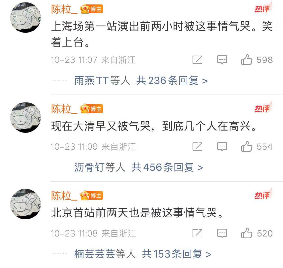 随后,陈粒又在评论区表示:“上海场第一站演出前两小时被这件事气哭,笑着上台。
