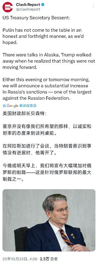 美国财政部长贝森特今天(北京时间10月23日)表示:“普京并没有像我们所希望的那样,以诚实和坦率的态度来到谈判桌前。在阿拉斯加进行了会谈,当特朗普意识到事情没有进展时,他离开了。今晚或明天早上,我们将宣布大幅增加对俄罗斯的制裁——这是针对俄罗斯联邦的最大制裁之一。” 要知道,美俄之间的制裁拉锯战已经持续了不少年,之前也有过几轮力度不小的限制措施,但这次贝森特敢说是“最大之一”,显然是准备拿出更狠的招数。 从以往的套路来看,这类大规模制裁大概率会涉及能源、金融、科技等多个关键领域。毕竟俄罗斯的能源出口是经济支柱之一,美方要是在这方面动手,比如限制俄罗斯石油、天然气的国际交易,很可能会直接影响俄罗斯的外汇收入。 金融领域也跑不了,说不定会进一步限制俄罗斯金融机构与国际市场的对接,比如切断更多银行与SWIFT系统的联系,让俄罗斯企业在跨境支付上遇到更大麻烦。 科技方面更不用多说,美国之前就对俄罗斯的高科技产品进口设了不少门槛,这次说不定会把限制范围扩大,从芯片、软件到精密仪器,只要能卡住俄罗斯产业升级的脖子,美方大概率不会手软。 不过贝森特这话里也藏着点微妙的信号,他特意提到“特朗普意识到事情没有进展时离开了”,这既像是在说明会谈破裂的直接原因,也像是在给外界传递“不是美方不想谈,是俄方不配合”的态度。 毕竟在国际舆论场上,谁先占据“愿意协商”的道德高地,谁就能争取到更多盟友的支持。美方这么说,明显是想把会谈失败的责任推到俄罗斯身上,为后续的制裁行动找个合理的借口。 但明眼人都清楚,美俄之间的分歧远不是“态度诚不诚实”能概括的。从乌克兰问题到地缘政治博弈,从核军控谈判到全球能源格局,双方在几乎所有重大议题上都存在深刻矛盾。 之前的多轮会谈之所以没成果,本质上是因为双方的核心利益诉求根本无法调和,而不是单纯的“态度问题”。贝森特把焦点放在普京的态度上,多少有点避重就轻的意思。 再看制裁本身,美方总觉得靠高压制裁能让俄罗斯屈服,但这么多年的事实已经证明,这招的效果越来越有限。 俄罗斯早就开始布局反制措施,比如推动能源交易用本币结算,加强与中国、印度等国的经济合作,逐步降低对美元体系的依赖。 之前美方加征制裁时,俄罗斯虽然面临短期困难,但总能通过调整经济结构、寻找新的合作伙伴来化解部分压力。 这次美方又要搞“最大制裁之一”,说不定俄罗斯早就做好了应对准备,不会轻易被打垮。 还有个有意思的点,贝森特选择在这个时间点放出消息,刚好是在会谈结束没几天,而且特意强调“今晚或明天早上”就宣布,这种急切的姿态反而有点耐人寻味。 是不是美方内部也有压力?毕竟长期对俄制裁不仅会影响俄罗斯,也会反噬美国自身的经济,比如推高美国国内的能源价格,影响美国企业在俄罗斯的市场份额。 要是这次制裁再没达到预期效果,美方可能会面临更多国内舆论的质疑。 另外,国际社会对美俄对抗的态度也很关键。之前美方搞制裁时,不少盟友因为自身利益考虑,并没有完全紧跟美国的步伐,有的甚至还在偷偷与俄罗斯保持合作。 这次美方又要搞“最大制裁之一”,能不能争取到足够多的盟友支持还是个未知数。要是盟友们态度消极,那这轮制裁的实际效果只会大打折扣。 贝森特现在把话说得这么满,万一后续制裁没达到预期,或者俄罗斯的反制让美方吃了亏,那美方的国际信誉只会进一步受损。 毕竟在国际交往中,光靠施压和制裁解决不了根本问题,坐下来平等协商才是正道。可美方显然还没明白这个道理,依旧想着靠强硬手段逼对方让步。 接下来就看今晚或明天早上,美方具体会公布哪些制裁措施,俄罗斯又会拿出怎样的反制手段。这场新的博弈,注定会给本就紧张的美俄关系再添一层不确定性,也会对全球经济、能源格局产生不小的影响。 但有一点可以肯定,靠制裁解决分歧的老路走不通,美方要是一直抱着这种思维,恐怕只会在与俄罗斯的对抗中陷入更深的僵局,最后受损的还是双方乃至全球的利益。