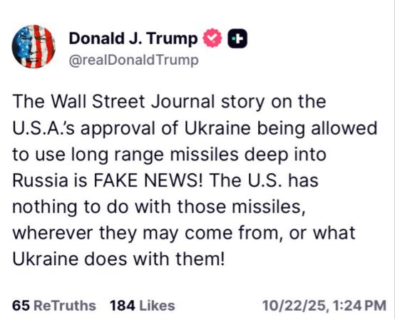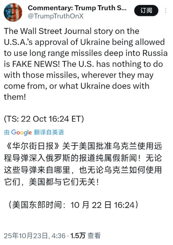 美国总统特朗普今天(北京时间10月23日)发文写道:“《华尔街日报》关于美国批准乌克兰使用远程导弹深入俄罗斯的报道纯属假新闻!无论这些导弹来自哪里,也无论乌克兰如何使用它们,美国都与它们无关!” 这话一出来,不少人都觉得有点琢磨不透,毕竟之前美乌之间在武器援助上的拉扯,早就不是什么新鲜事儿了。 要知道,从乌克兰危机升级开始,美国给乌克兰的武器支援就没断过档。先是常规的单兵武器、装甲车,后来慢慢升级到防空系统、榴弹炮,一步一步在突破之前设定的“红线”。 就像去年,美国一开始还犹豫要不要给海马斯火箭炮,后来不仅给了,还配套提供了射程更远的弹药,当时就引发过一波关于“是否会激化冲突”的讨论。 现在《华尔街日报》突然爆出“美国批准远程导弹”的消息,虽然特朗普直接否认,但外界难免会联想到之前的种种细节。 比如上个月,乌克兰官员就公开提过,希望美国能提供ATACMS导弹,这种导弹射程能到300公里左右,要是真拿到手,乌克兰打击俄罗斯本土的能力会大幅提升。 当时美国白宫的回应特别模糊,只说“会根据战场情况调整援助”,没直接答应也没直接拒绝,这种态度本身就容易让人多想。 而且之前也有过类似的情况,美国在武器援助上经常是“先否认后松口”。就像2023年,有媒体报道美国要给乌克兰提供贫铀弹,一开始美方也是不承认,结果没过多久就悄悄列入了援助清单。 所以这次特朗普说“美国无关”,不少观察人士都在等着看后续会不会有变化,毕竟“假新闻”的说法,在之前的类似事件里也不是第一次出现了。 再看俄罗斯这边的反应,之前只要美国有升级对乌武器援助的苗头,俄罗斯就会强硬回应,说这是“把冲突推向新高度”,还会采取反制措施。 要是这次《华尔街日报》的报道真有几分真实,哪怕美国没明着“批准”,只是暗中默许,俄罗斯肯定也不会坐视不管。 之前俄罗斯就对向乌克兰提供武器的国家实施过制裁,还打击过乌克兰储存西方武器的仓库,要是真出现远程导弹打击本土的情况,俄罗斯的反制力度大概率会更大。 还有美国国内的情况,现在距离美国大选越来越近,特朗普作为共和党热门候选人,在对乌政策上一直有自己的一套说法。 他之前就说过“要尽快结束俄乌冲突”,还批评过拜登政府对乌援助“花钱太多”,这次否认“批准远程导弹”,说不定也有拉拢国内反对大规模对乌援助选民的意思。 毕竟美国国内现在对是否继续给乌克兰砸钱,分歧已经越来越大,不少民众觉得应该把钱用在国内民生上,而不是花在国外的冲突里。 另外,《华尔街日报》作为美国主流媒体,一般不会随便发“假新闻”,尤其是这种涉及外交和军事的敏感话题,肯定是有一定消息来源才会报道。 虽然特朗普直接否定,但媒体后面会不会放出更多证据,比如匿名官员的爆料、相关文件的片段,这些都还不好说。 之前就有过媒体报道和政府说法不一致的情况,最后往往是媒体手里的信息更接近真相,所以这次的“假新闻”争议,估计还得持续一段时间才能有眉目。 还有一点特别有意思,特朗普在发文里特意强调“无论这些导弹来自哪里”,这话其实有点耐人寻味。要是这些导弹真的不是美国提供的,那会不会是其他北约国家? 比如英国之前就给过乌克兰“风暴阴影”巡航导弹,这种导弹射程也不短,能打击俄罗斯境内目标。 要是乌克兰这次用的是这类导弹,美国确实能说“与自己无关”,但北约国家之间本来就有军事合作,美国就算没直接提供,会不会在背后默许甚至协调,这也是外界关心的点。 而且从战场情况来看,乌克兰最近一直在试图突破俄罗斯的防线,尤其是在南部和东部战线,进展不算太顺利。 要是能拿到远程导弹,乌克兰就能打击俄罗斯后方的军火库、交通枢纽,打乱俄罗斯的补给线,这对改变战场态势有很大帮助。 所以乌克兰一直急着要这类武器,美国这边的态度就成了关键。要是真像特朗普说的“美国无关”,那乌克兰想拿到远程导弹的希望,可能就得寄托在其他国家身上了。 不过话又说回来,就算美国没直接“批准”,但美国对乌克兰的情报支持一直没断过,比如给乌克兰提供卫星图像、俄军动向信息,这些其实都在帮乌克兰更好地使用各种武器。就算导弹不是美国的,有了美国的情报支持,乌克兰照样能精准打击目标,从这个角度看,美国其实还是深度参与其中,想完全撇清关系,恐怕没那么容易。 现在各方的关注点都集中在后续的证据上,《华尔街日报》会不会回应特朗普的“假新闻”说法,美国白宫会不会有更详细的表态,俄罗斯会不会拿出乌克兰使用远程导弹的证据,这些都会影响事件的走向。 要是最后证明报道是真的,那特朗普的否认就会变成“谎言”,不仅影响他个人的信誉,还可能让美国在国际上陷入被动;要是报道真的是假的,那《华尔街日报》的公信力就得打个折扣,还可能被质疑是在“煽动冲突”。