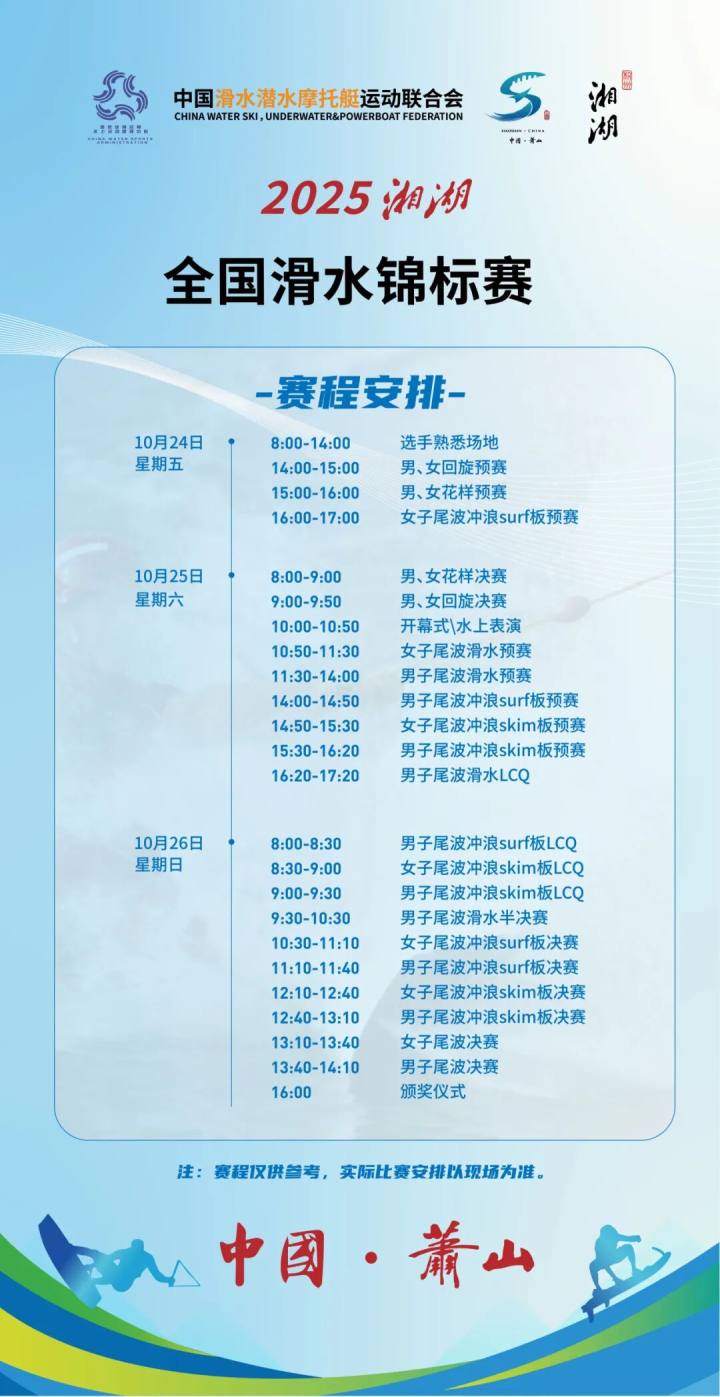 赛程安排方面,参加全国滑水锦标赛的选手将于10月23日完成报到,24日将陆续开展多组别预赛,26日进行决赛。参加动力冲浪板青年锦标赛的选手将于10月26日完成报到,27日将陆续开展多组别预赛,29日进行决赛。