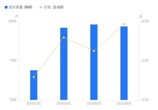 日期A股户数(户)流通A股户均持股数(股)户均持股市值(万元)2025-09-30968042995.8768.062025-06-30980242460.7259.952025-03-31959343385.8064.952024-12-31688460459.0475.282024-09-30649964040.6283.842024-06-30679861223.8966.562024-03-31660916629.9823.362023-12-31523221006.7948.832023-09-30608118073.9240.682023-06-30597718388.4148.65