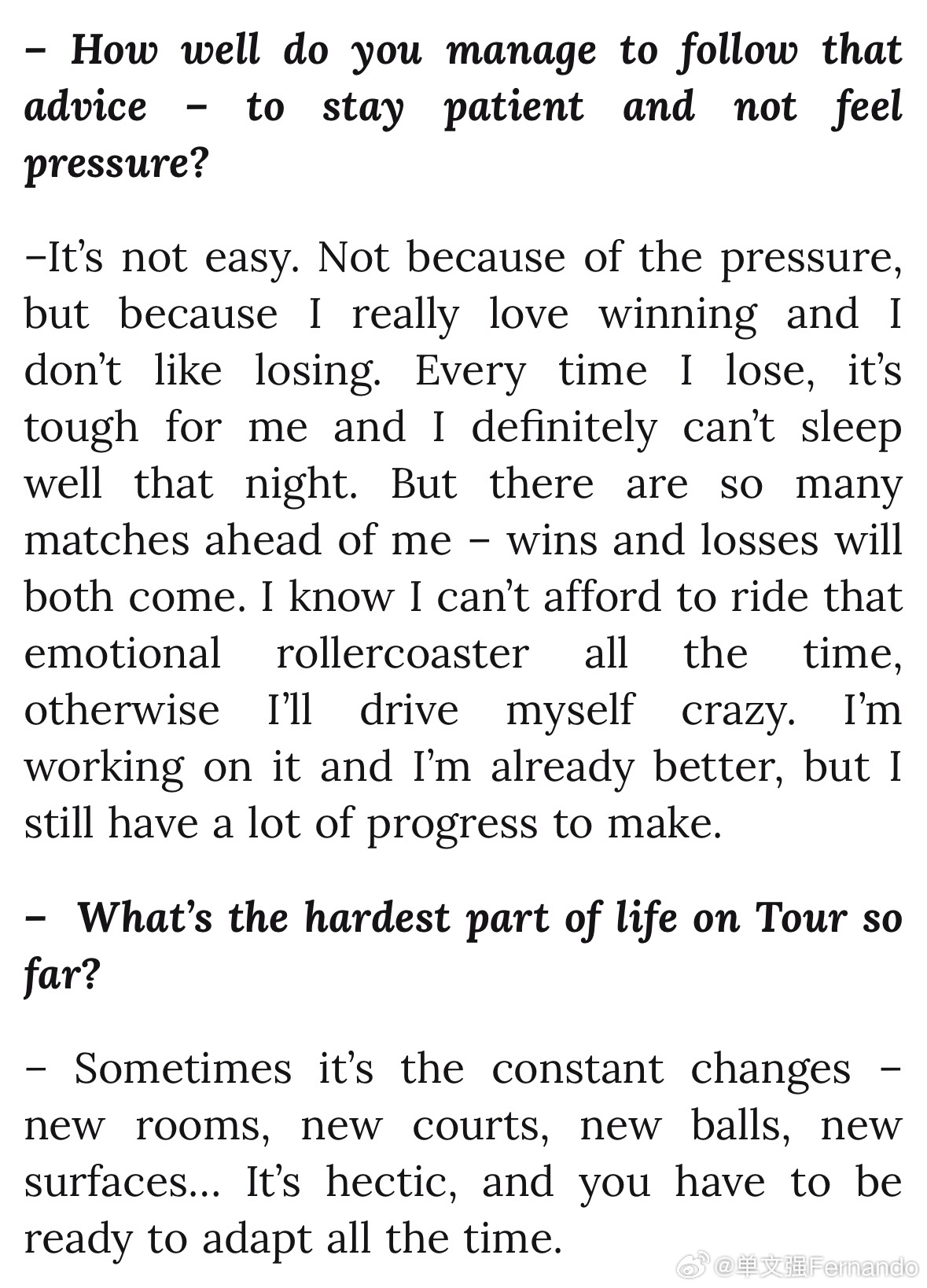 【第一个完整赛季】这一年我见到了很多人,初来乍到一切都很不一样,就像不一样的世界,现在我有更多朋友了,属于巡回赛了!我还很享受旅行,以前从没飞过那么多地方,现在喜欢这样的经历,可能过几年我会疲倦,但现在享受看全新的世界!