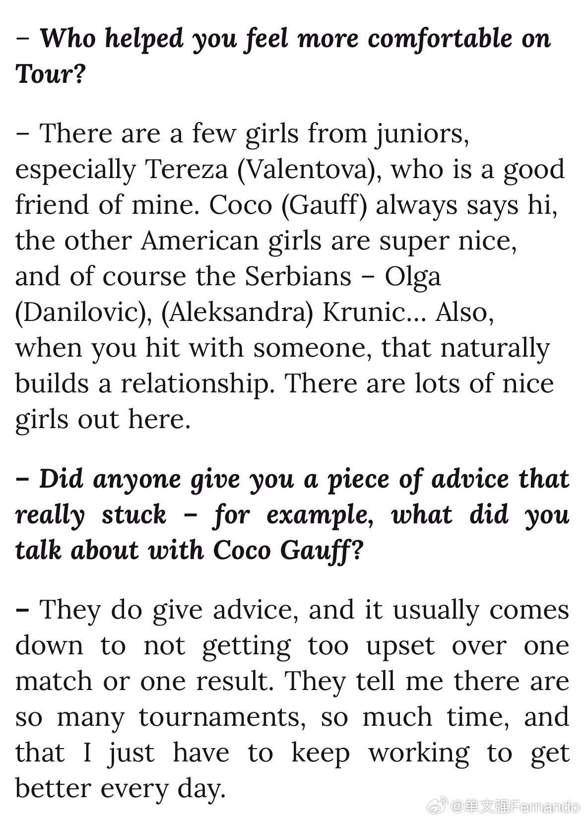 【巡回赛好朋友】瓦伦托娃,从青少年时期一起成长的好朋友!Coco高芙总是打招呼,美国女孩都很好,还有塞尔维亚女孩们,达尼洛维奇和克鲁尼奇…当然和球员们合练也会建立好的关系,很多女孩都不错!