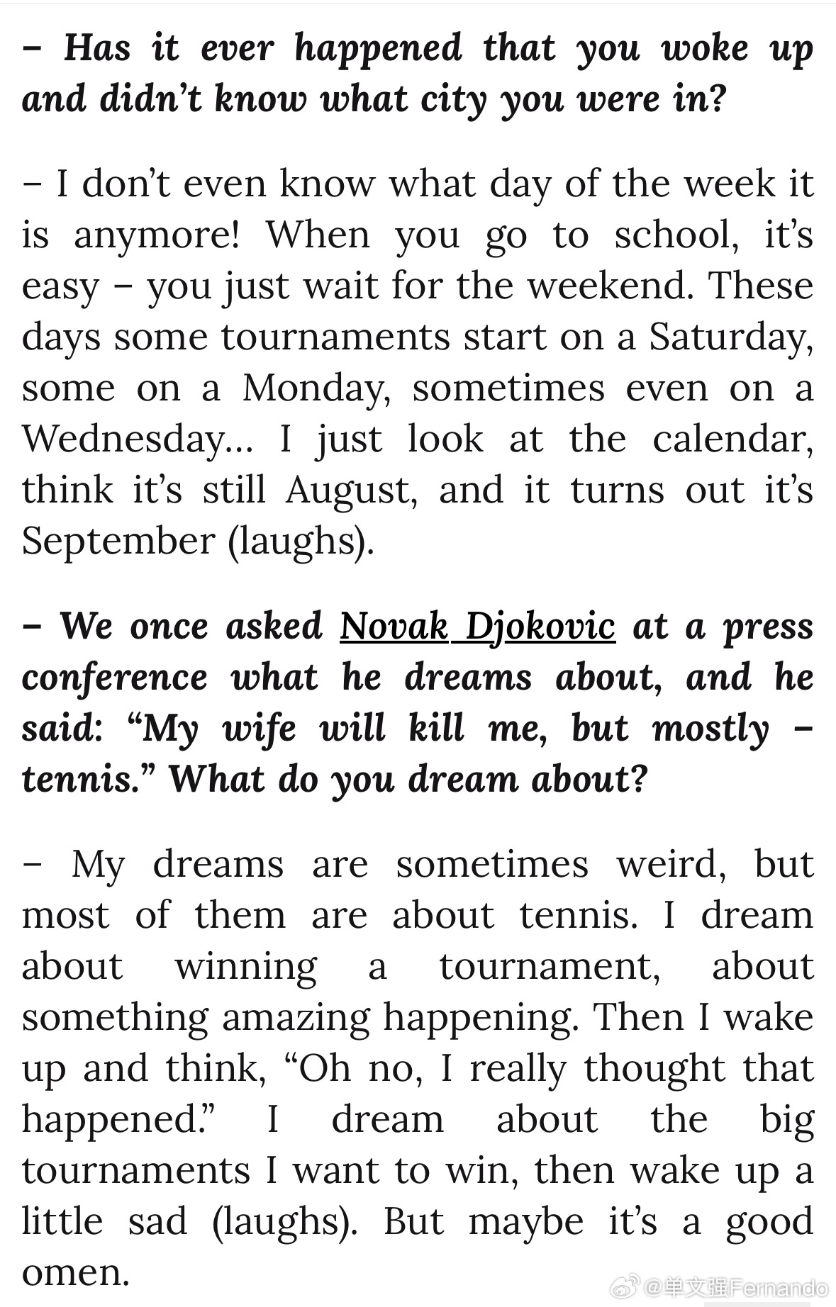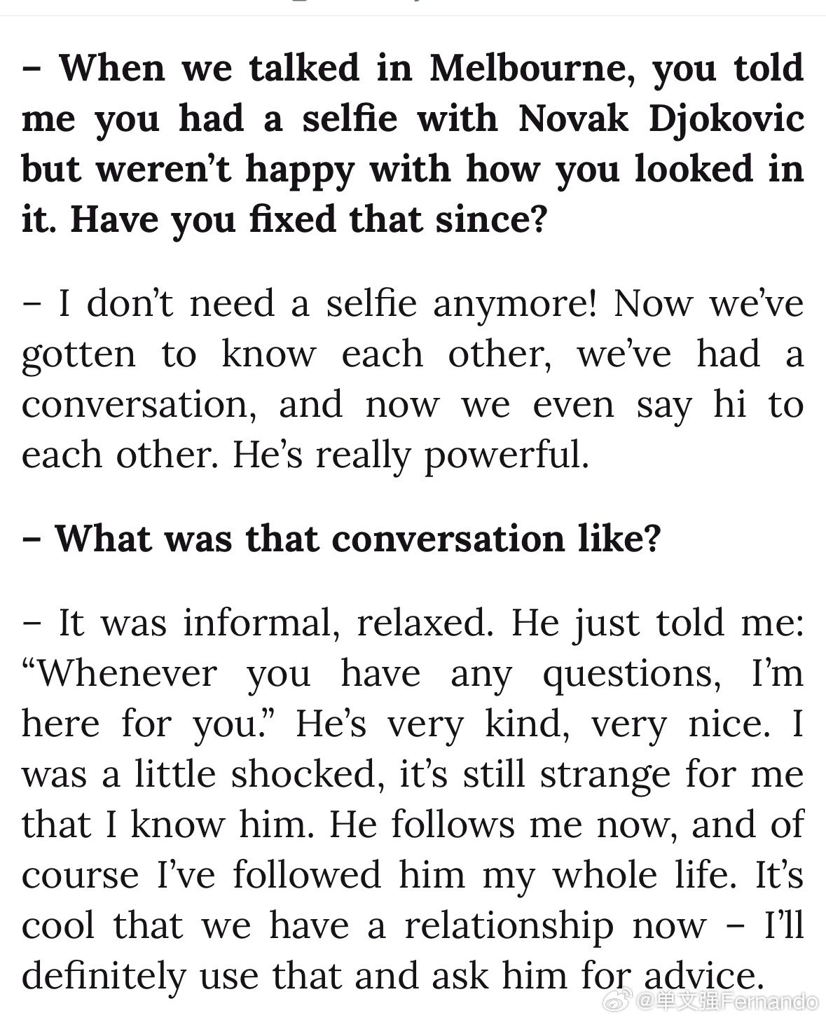 【和德约科维奇】我不需要再求自拍了,我们认识了,我们有对话交流,可以互相打招呼,他很有力量感!他和我说有任何问题可以直接找他,我仍然惊讶我竟然能认识Novak,他开始关注我了,很高兴我们能建立联系!