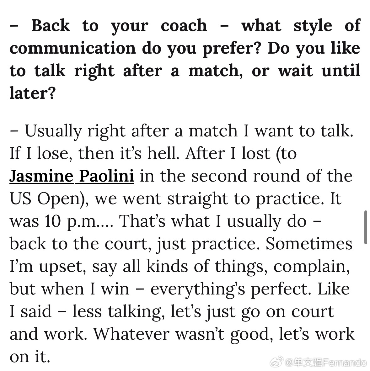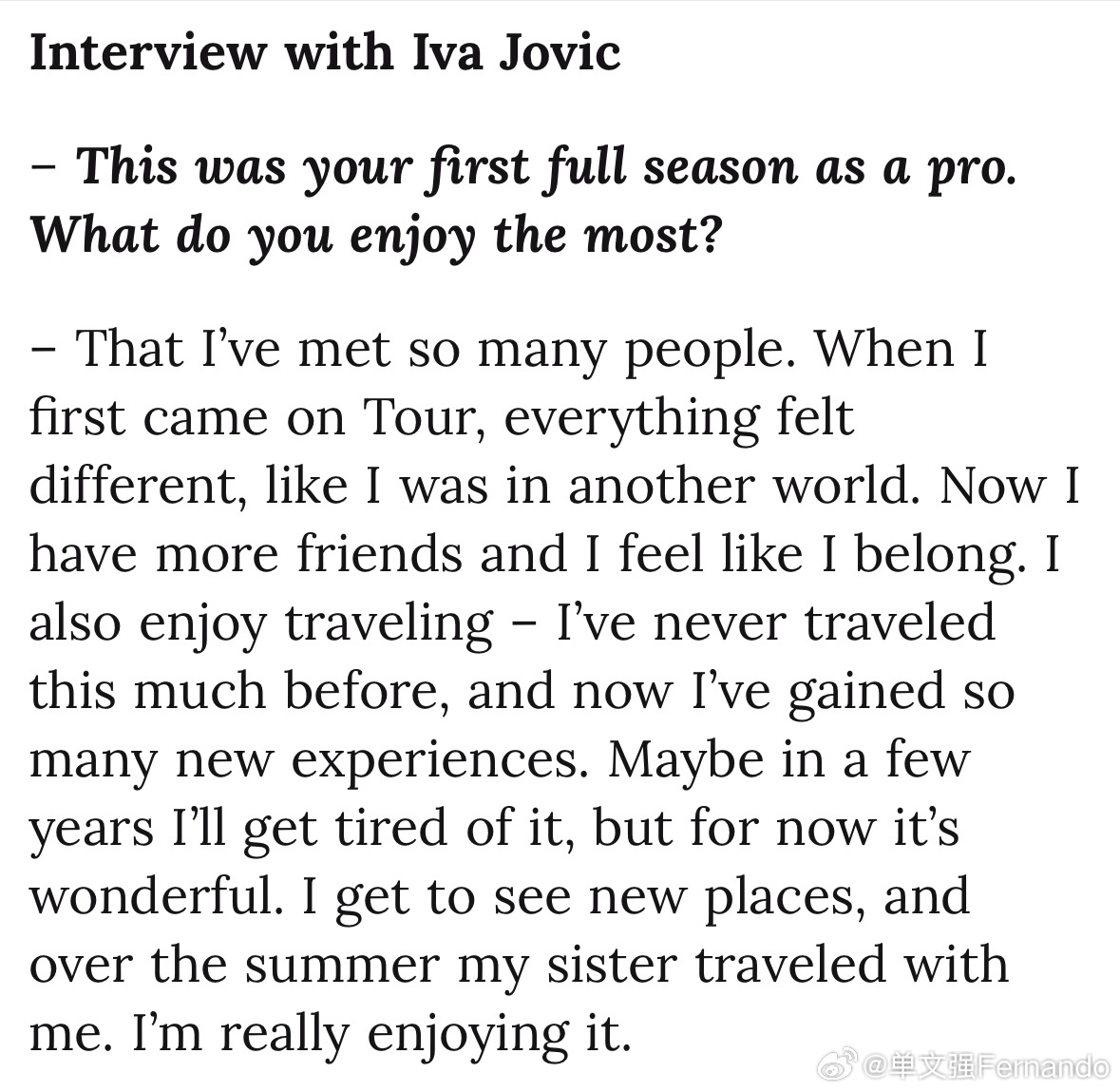 Iva还分享美网2025输给保利尼的赛后,直接就和教练去训练场加练了,当时晚上10点…另外还说自己喜欢本西奇的打球风格!还觉得萨巴伦卡和辛纳身上都有那种光环星光😇的感觉!wta[超话]