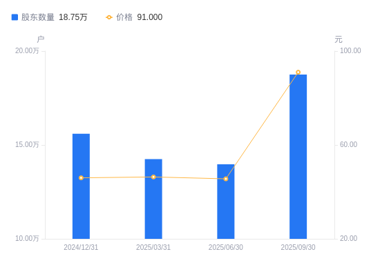 日期A股户数(户)流通A股户均持股数(股)户均持股市值(万元)2025-09-301874719929.2590.362025-06-3013968113326.3360.722025-03-3114249213063.4360.572024-12-3115599111932.9654.892024-09-3015715811844.3556.902024-06-3014691412670.2349.642024-06-0714878912511.3550.732024-05-3115795111785.6345.302024-05-2016211811482.6941.832024-04-1916423811334.4738.26