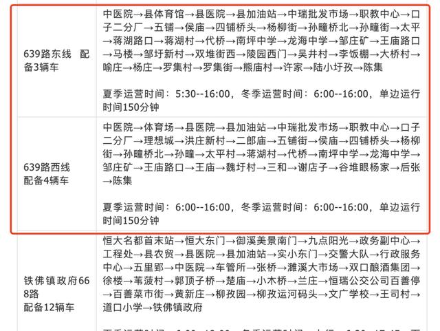 据了解,639号分为东西线,始发站均为中医院站,终点站为陈集站,冬季的运营时间为每天6:00至16:00,单边运行时间大约需要两个多小时,途中经过30多个站点。根据车型及站点停靠数,设定了差异化票价梯度:“车辆共设45个座位,每站都停的是普通车,全程票价1元;空调车票价2元;只停靠部分站点的是快车,票价8元。”此外,运营方充分考虑到群众实际需求,车型为大巴类型,可存放大件行李。