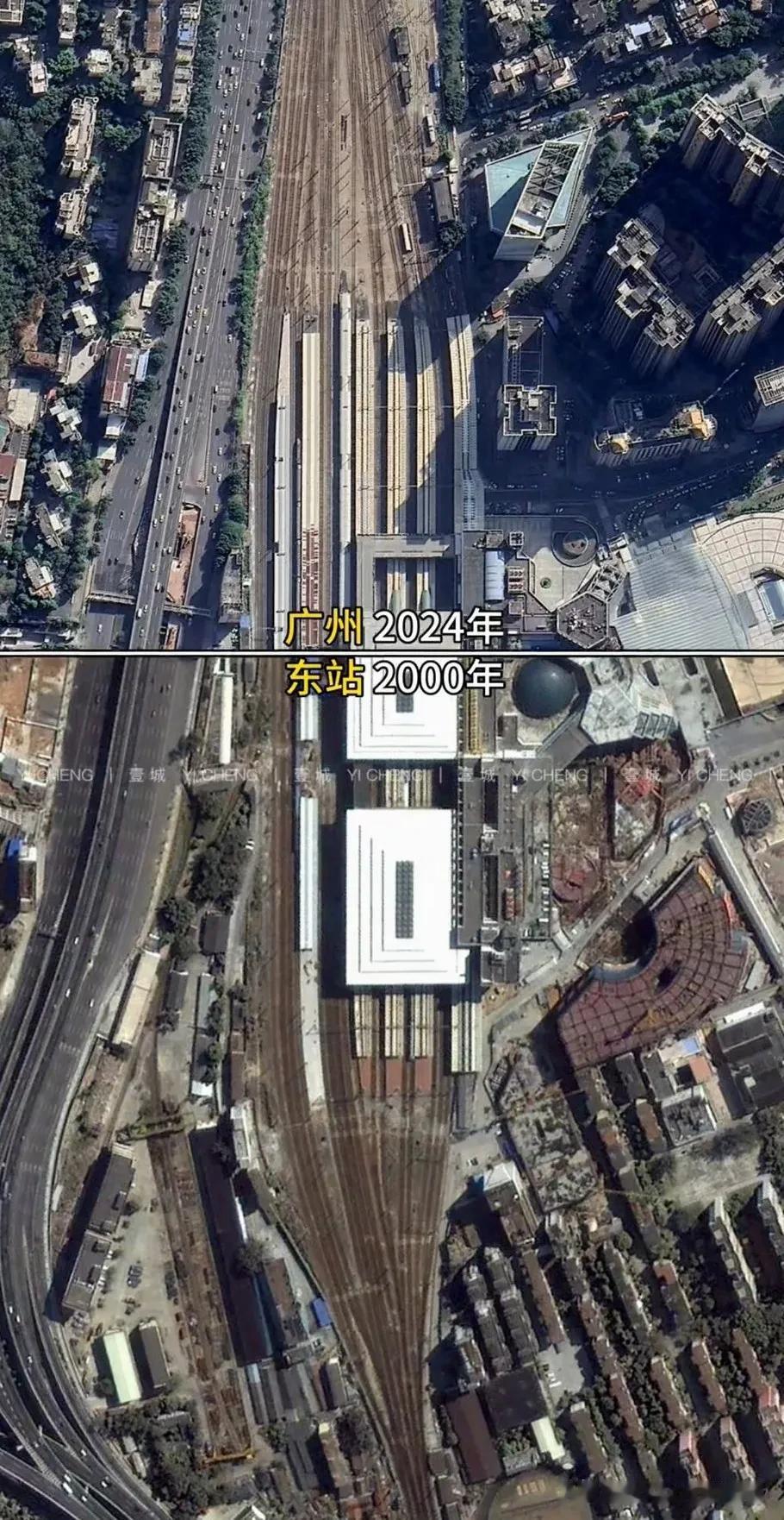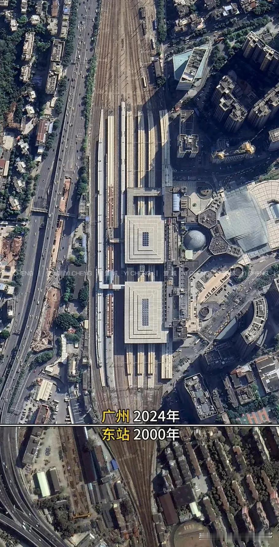 卫星视角下,广州东站2024年与2000年发生的变化对比。20多年间的时间,广州