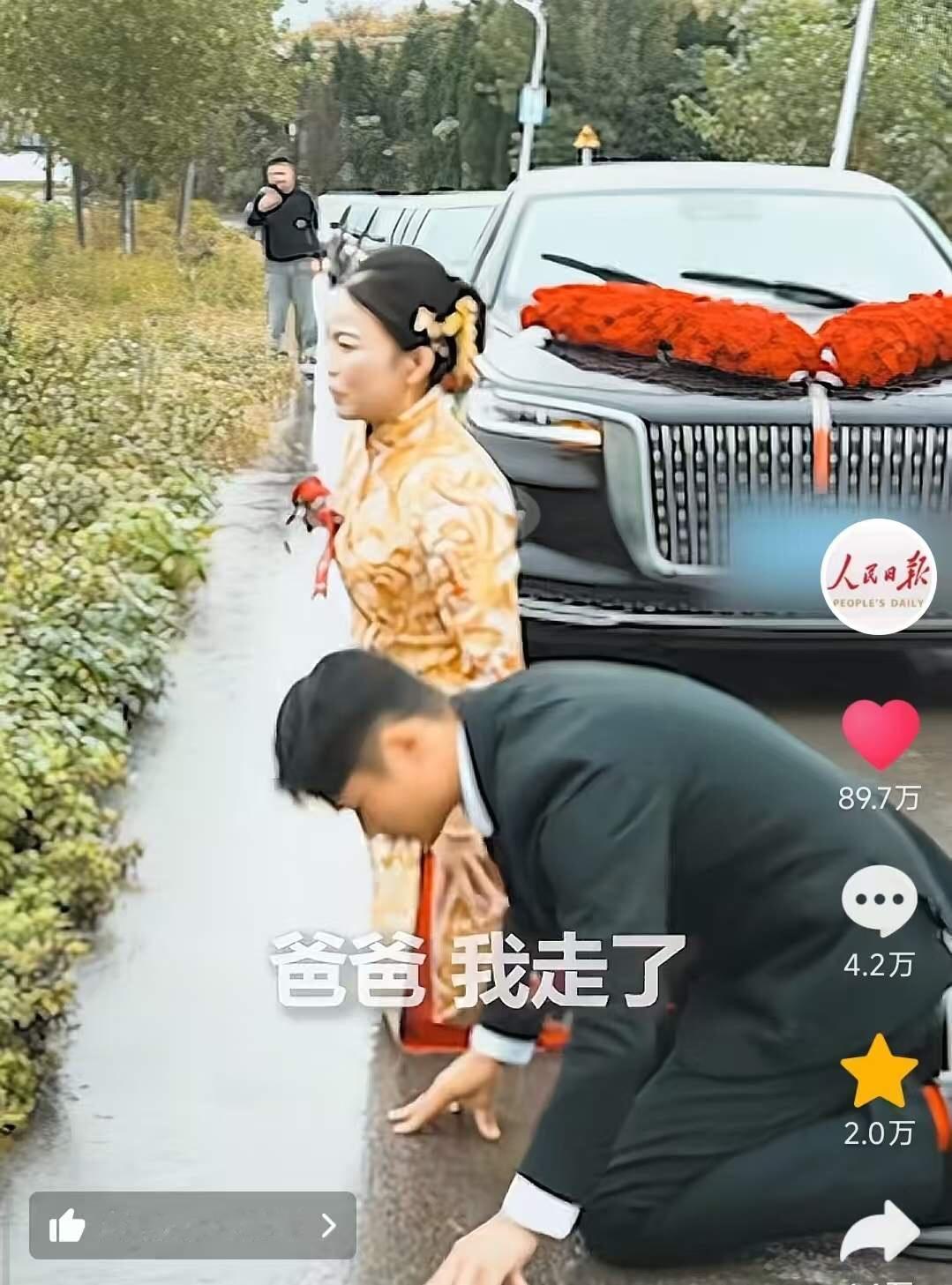 ”这个新娘火到人民日报!“江苏徐州,新娘出嫁途中大喊停车,从车上下来跪在了地上……而她说的一句话,让在场的人都泪目了!网友:这新娘是个好媳妇,结婚没有嫌弃地上脏,直接跪上去。一般人做不到,值得被善待! 这个新娘火到人民日报!在徐州,一个平凡的婚礼场景却因一句话、一幕动作瞬间点燃了无数人的心——她,是一位真正懂得珍惜和尊重的人。 事情的经过很简单,但背后的意义却深远。婚礼当天,新娘和新郎正准备出发,迎接人生中最重要的一天。然而,途中车子突然出现了故障,堵在了路上。面对突如其来的变故,很多人可能会焦躁不安,甚至抱怨命运的不公。但这个新娘,却做出了令人动容的举动——她大喊一声“停车!”,然后毫不犹豫地下车,跪在了泥泞的地上。 这个瞬间,被摄像机捕捉到的画面瞬间刷爆了网络。有人也许会觉得奇怪:她为什么要这样做?难道她觉得地脏,怕脏?但细细品味,却能看到一份深深的尊重与感恩。她没有嫌弃地上的泥土,没有抱怨自己被耽搁的命运,而是用最真诚的方式表达了对这片土地、对这份婚礼的珍惜。 更令人动容的是,她轻声说出的话:“感谢这片土地,感谢每一寸养育我们的土地。”简单的一句话,却像一股暖流,瞬间融化了在场所有人的心。现场的亲友们都被这份真情打动,甚至有人忍不住流泪。 网友们纷纷评论:“这才是真正的好媳妇!结婚不仅是两个人的事,更是对生活、对土地、对亲情的尊重与感恩。”“她用行动告诉我们,尊重和感恩,是最美的情感表达。”还有人说:“现代社会太快了,太浮躁,但这份真诚值得我们每个人去学习。” 这件事让我们反思:在这个快节奏、功利化的时代,是否有人还记得那份最纯粹的感情?是否有人愿意用行动去表达对生活的敬畏?这个新娘,用最朴实的方式,向我们展示了什么叫“心存感恩”。她没有嫌弃泥土,没有抱怨命运的不公,而是用一颗真诚的心,告诉我们:尊重生活、珍惜当下,才是人生最宝贵的财富。 或许,这场婚礼的“仪式”中,最感人的不是鲜花和礼金,而是这份从心底流露出的感恩与敬意。它告诉我们,每一个平凡的瞬间,都可以变得伟大,只要我们用心去感受、去珍惜。 这不仅是一场婚礼的故事,更是一面镜子,映照出我们每个人内心深处的那份善良与真诚。在这个充满喧嚣的世界里,也许我们都需要这样一份温暖,一份来自生活最本真的感动。你,准备好用心去感受了吗?出嫁感人一幕 新娘奇葩言论 新娘哭泣