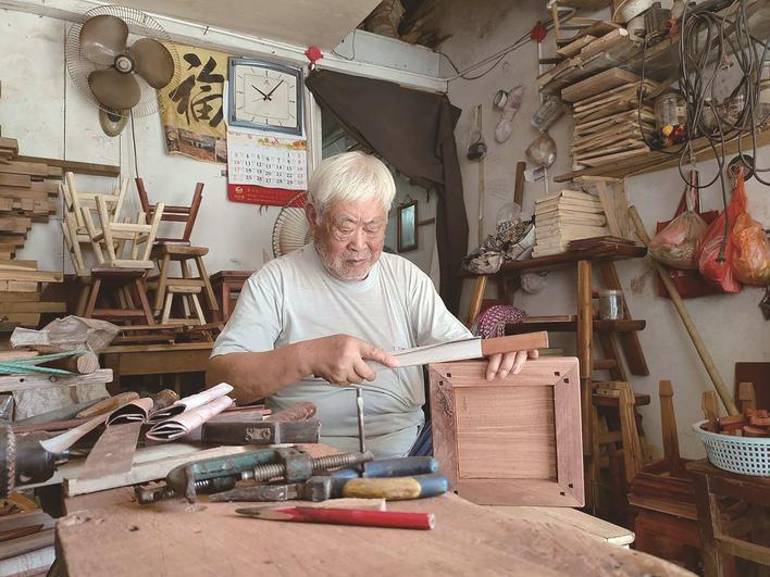 谈及与木工手艺的缘分,金关荣的思绪回到了1959年。“那年我17岁,家里兄弟6个。父母说,学门手艺能糊口,就送我去学木工了。”他坐在工作台旁的木凳上,回忆起往事,语气里满是感慨。