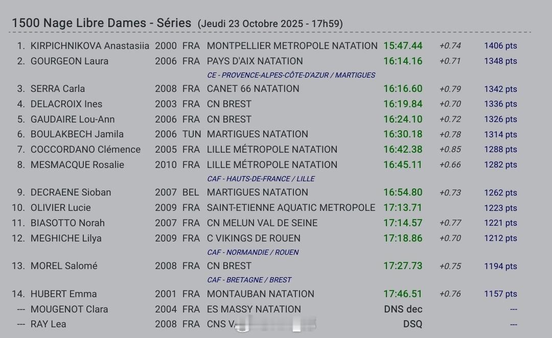 女1500自:Anastasia Kirpichnikova 15:47.44
