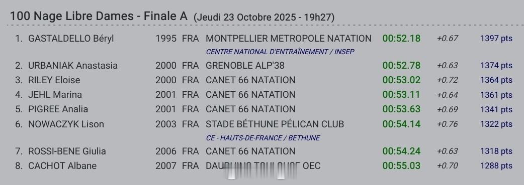 女100自:Beryl Gastaldello 52.18 ​​​