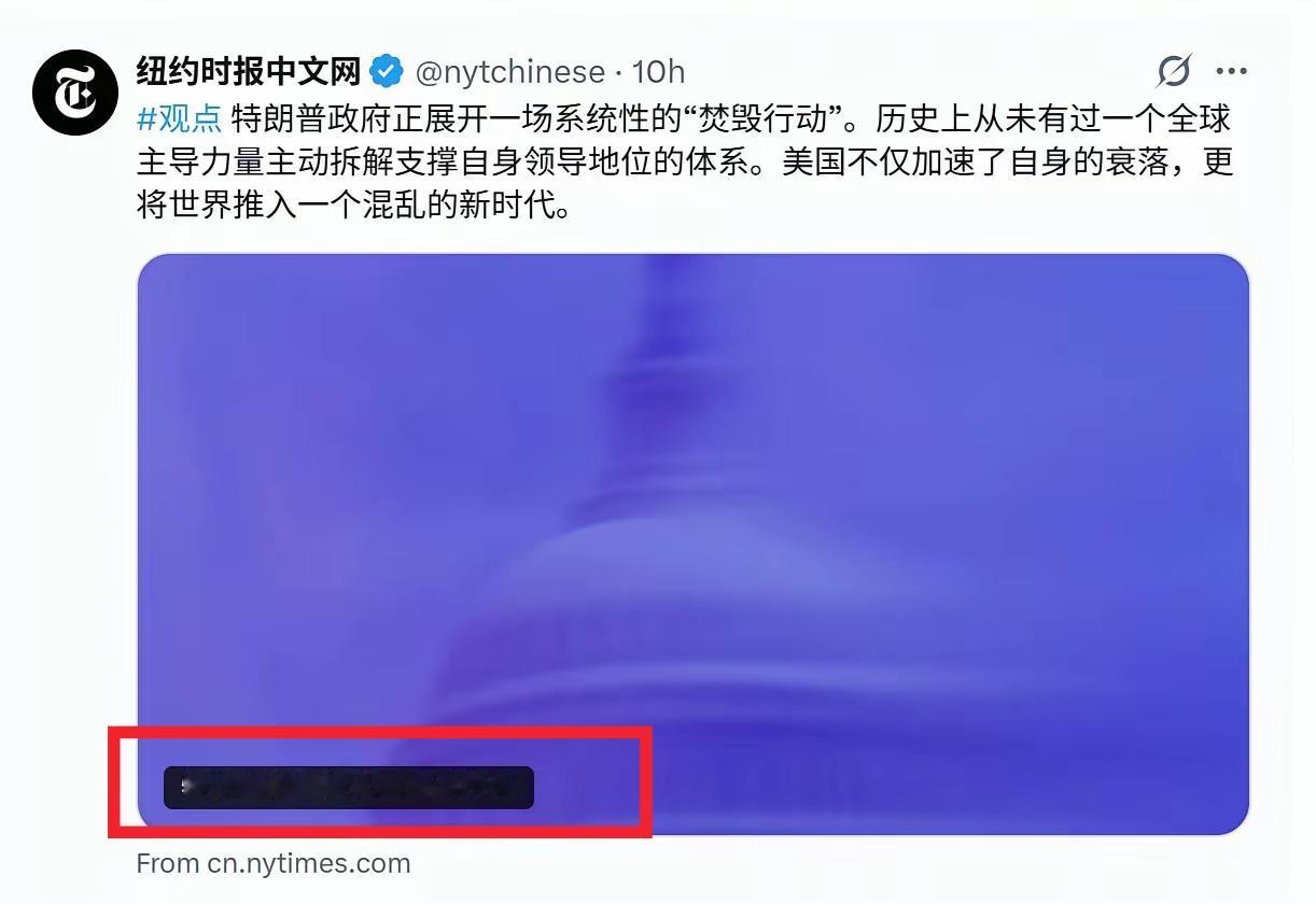 纽约时报评论特朗普和美国:特朗普政府正展开一场系统性的“焚毁行动”。历史上从未有过一个全球主导力量主动拆解支撑自身领导地位的体系。美国不仅加速了自身的衰落,更向世界推入一个混乱的新时代。 表明看,纽约时报的评论切中要害,但实际上是世界到了无法继续忍受美国恶贯满盈的霸权,要将其推翻的时候,特朗普不过是在恰当地时候被美国人民选为总统,而他又用他的狂妄、傲慢、无理和浅薄的政治智慧证明,他恰恰就是为完成这一使命而来。 历史无数次证明,包括像美国在内的这样的超级大国要想毁灭或被毁灭,外力是很难做到的,只有从内部开始腐烂或者出现一个贪婪无度、自私无度,而又缺乏足够智谋和勇气治理国家的人,这个国家的昌盛也就到头啦。所以,从某种意义上来说,特朗普是全世界各国派到美国毁灭它的卧底,而他正起劲地完成着毁灭美国的使命,可不是纽约时报说的他在美国自杀。