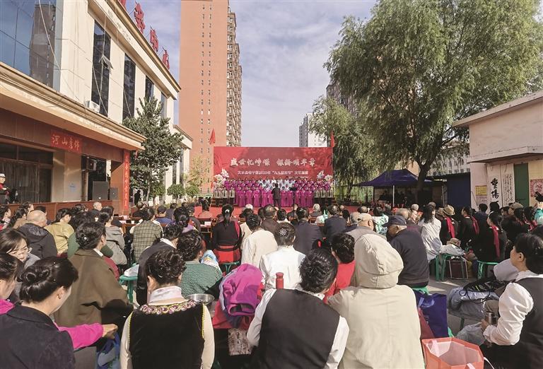 此次文艺展演以开场舞《东方红》拉开序幕,20余个节目涵盖合唱、器乐合奏、舞蹈、走秀、三句半、书法配诗朗诵等形式。其中,老干部联谊会大合唱《四渡赤水出奇兵》旋律激昂,老年大学走秀班《英姿飒爽》尽显银龄风采,合唱协会《歌唱英雄刘胡兰》传递红色精神,书法配诗朗诵《大诗书诵重阳》融合笔墨书香与家国情怀,赢得阵阵掌声;现场还展示面塑、剪纸等民间艺术作品,新增健身气功项目,凸显传统与红色元素融合的特色。