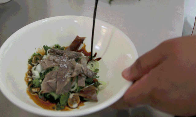 观其制,匠心独运。壮夫攘臂三汗落,素手抟雪千揉匀。高筋粉承黄河沃土之滋养,温盐水合阴阳相济之妙理。揉捏抻拽,得“三光”境界;醒擀扯拉,成两米白练。或宽如玉带,或细若丝芒;能空其中,可棱其旁。沸汤翻滚如玉龙入海,冰水激荡似昆冈凝霜。碗底铺山地牛肉,肌理如云纹叠翠;面巅堆秦椒香料,赤金共翡翠交辉。瓜丝青而玉立,菜叶绿而含香。撒蒜若碎雪,布椒似流霞,秦椒分粗细双态,花椒缀星点微霜。葱花一撮,碧雨轻飏;芝麻数粒,玄珠暗藏。