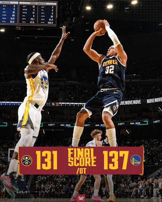 虎扑10月24日讯今日NBA常规赛,掘金131-137不敌勇士。