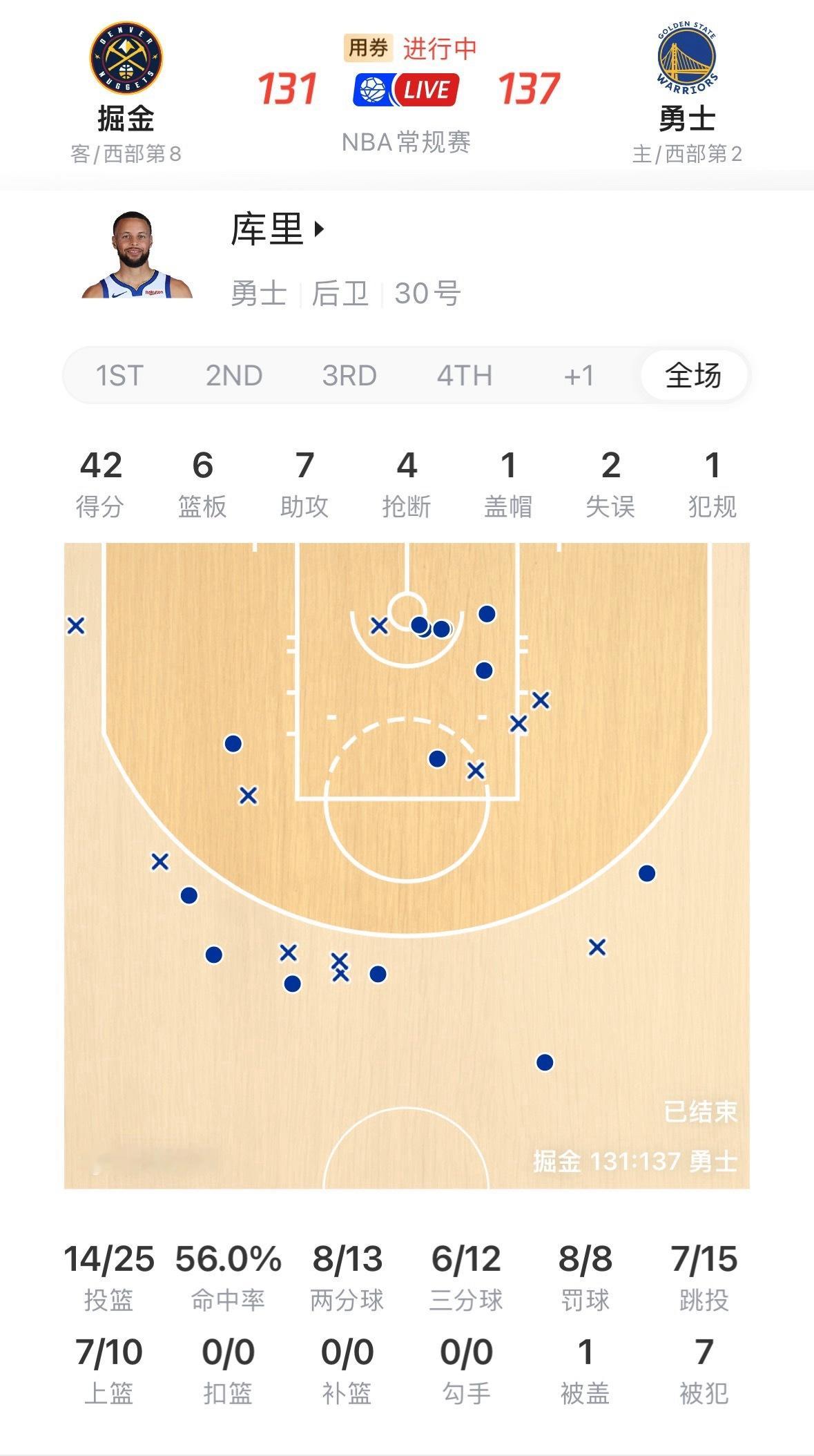 库里42分6板7助攻4抢断,三分12中6。