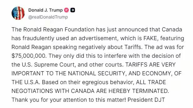 特朗普又翻脸了!这次是跟加拿大! 因为一则广告,特朗普很生气。特朗普在真实社交上发文指责加拿大以欺诈手段使用一则罗纳德·里根对关税的言论作为广告,意在干扰美国最高法院和其他法院对其关税政策的裁决,特朗普认为加方的行为极其恶劣,因此终止了与加拿大的所有贸易谈判。 特朗普为啥要如此大动干戈?很简单啊,因为加方的做法是对的,正好刺痛了美方的痛处。