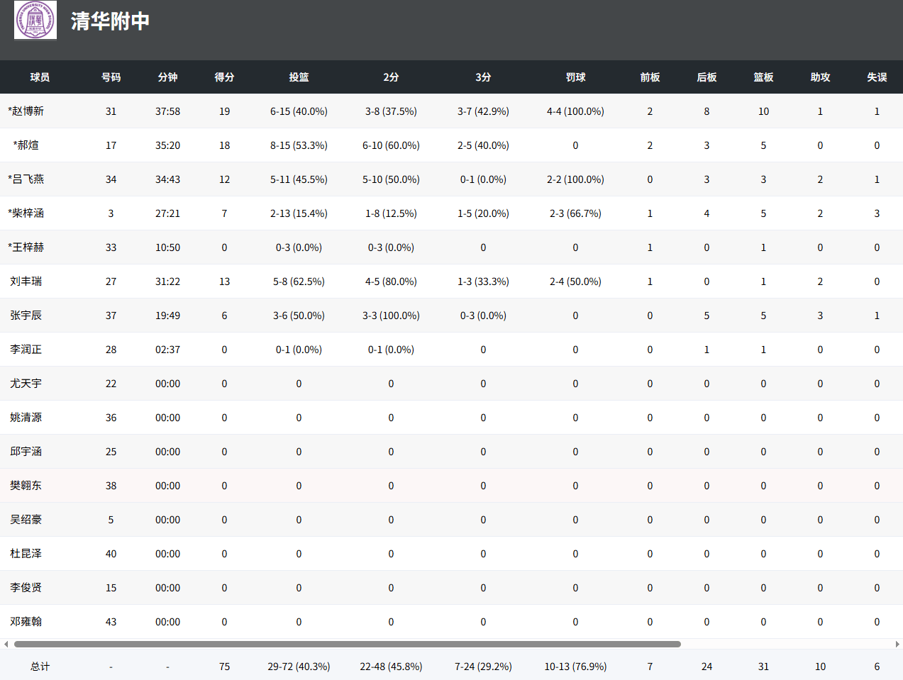 清华附中:赵博新19分10篮板、郝煊18分、刘丰瑞13分