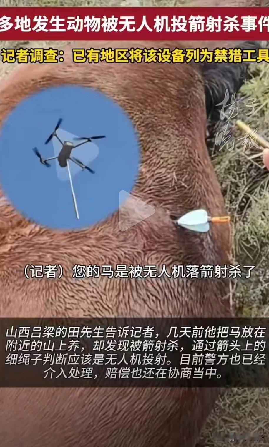 2025年10月18日山西吕梁养殖户田先生放养的马群遭改装无人机高空投射重达1斤、长75厘米的金属箭贯穿背部致死。肇事者声称利用热成像技术狩猎野猪,因目标识别错误(马匹体温与野猪相似)导致误杀。目前警方已介入处理此事。这之前多地禁猎公告已明确禁止“无人机投射箭支”。 改装无人机+热成像+投射金属箭,这套组合彻底改变了传统狩猎的规则和风险,对地面的人畜构成了前所未有的威胁。这要是换人呢,细思极恐。现在很多无人机在飞,如何管控,制定相关制度,确实是迫在眉睫的事情了。唯有唯有让规则追上创新的翅膀,健全规则才能避免天空沦为法外之地。
