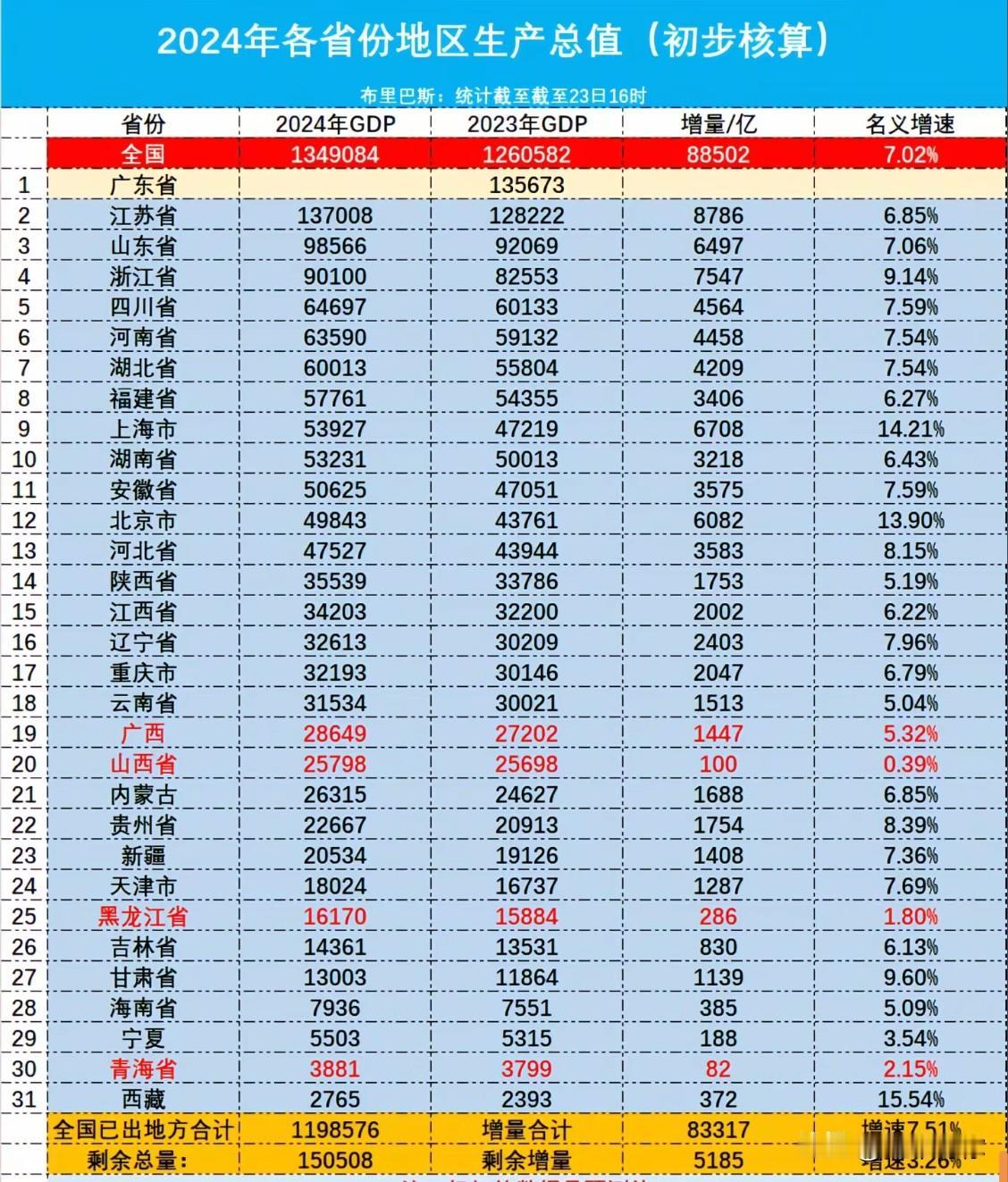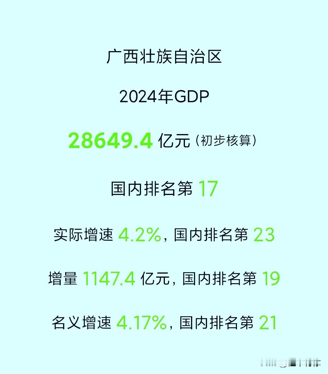 今年广西GDP有望突破3万亿大关!从前三季度5.3%增速看,预计今年增量会在1400—1500亿之间。2024年GDP总量是28649亿,所以今年突破3万亿应该是没有压力。不过与前面云南省比,还有3000亿左右的差距,想要超越云南省最起码还需要10年时间。