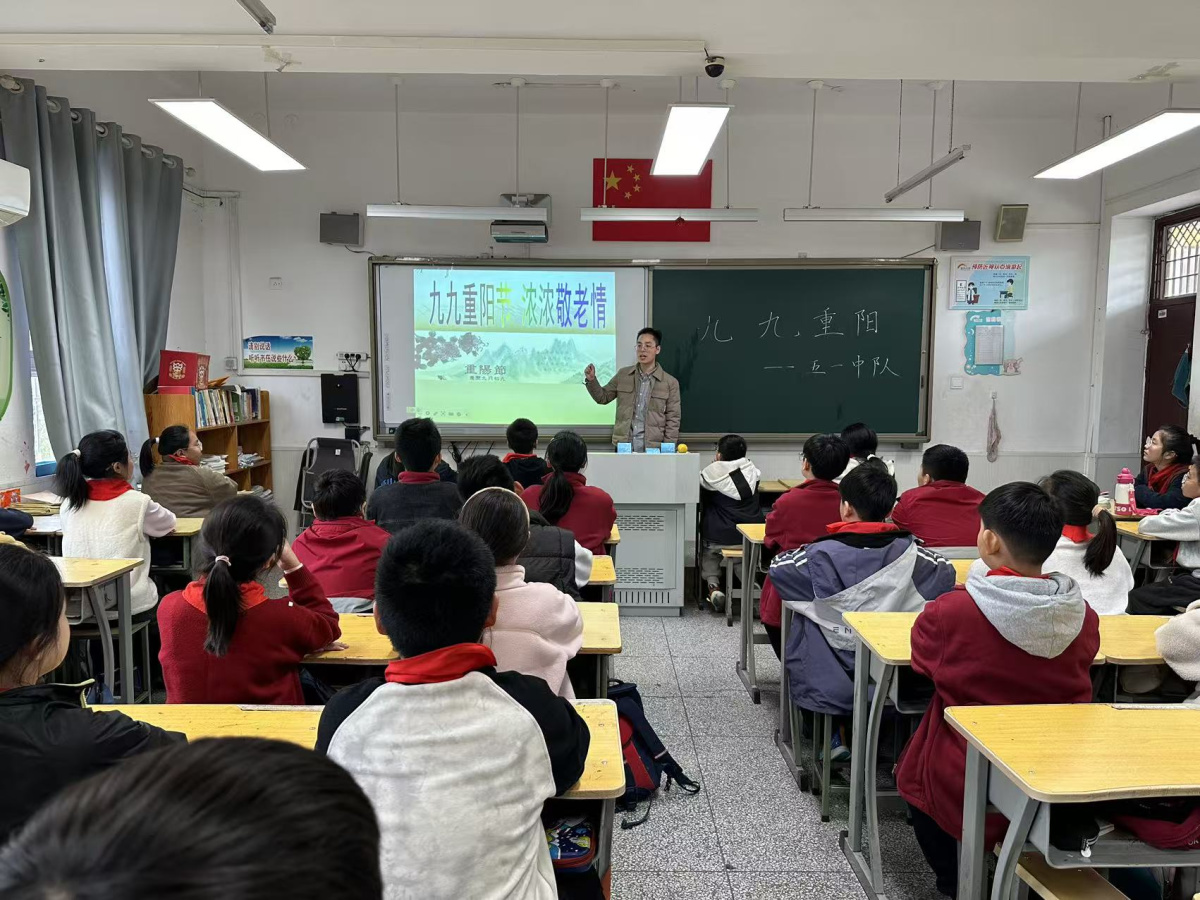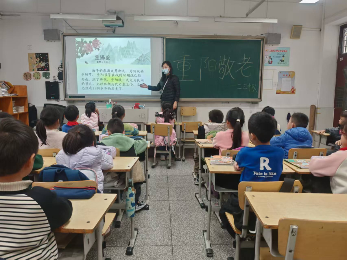 课堂上,中队辅导员借助图文并茂的课件,从重阳节的起源讲起:结合《易经》中“九为阳数”的说法,介绍“两九相重”得名“重阳”的由来,还讲述了东汉恒景拜师除瘟魔的传说,让队员们了解登高、插茱萸习俗的起源。辅导员逐句解析王维的《九月九日忆山东兄弟》,引导队员体会诗中的思乡情,感受古人过重阳的情怀。