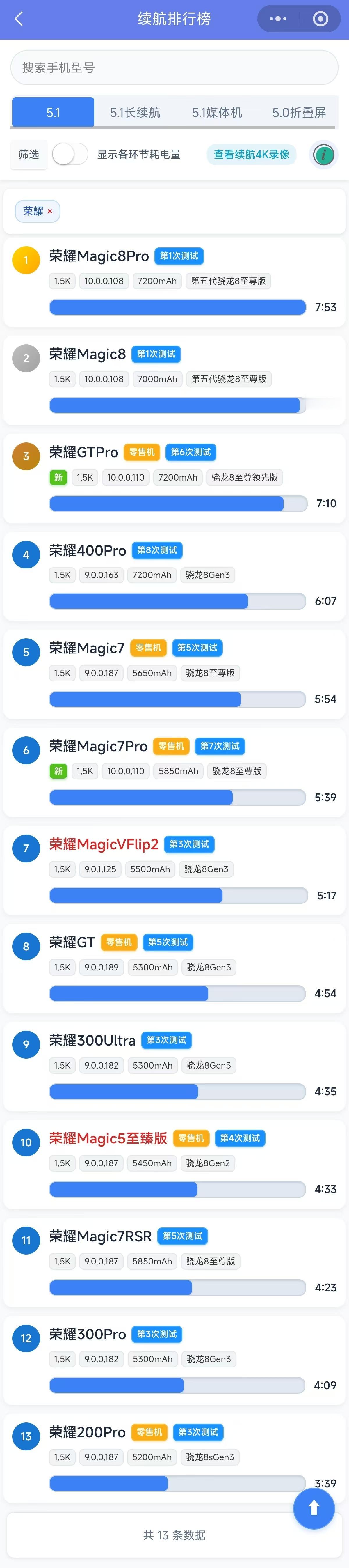荣耀第一批MagicOS 10.0旧机型复测续航成绩公布: 近期MagicOS10.0第一批陆续推送,我们在第一时间进行升级,并在两天后进行续航复测: 荣耀Magic7Pro零售机总续航时间5小时39分钟,相较于上版本续航减少6分钟 荣耀Magic7RSR总续航时间4小时27分钟,相较于上版本续航增加4分钟 荣耀GTPro零售机总续航时间7小时10分钟,相较于上版本续航减少9分钟 荣耀400Pro总续航时间6小时01分钟,相较于上版本续航减少6分钟 这几台机的续航变化不大,基本算是正常波动范围。 荣耀Magic7零售机总续航时间5小时37分,相较于上版本续航减少17分钟,续航小幅缩短。 马上vivo、OPPO、一加、真我、努比亚、红魔旧款手机推送年度大版本系统更新之后,我们也会进行复测,大家请持续关注我们。 鸿蒙6系统的华为Mate70系列和Pura80系列今晚复测。 vivoX300系列零售机、OPPOFindX9系列零售机、iQOO15零售机、真我GT8系列零售机、努比亚Z80Ultra零售机、荣耀Magic8系列零售机、红米K90系列零售机已经全部安排测试,测试结果会陆续公布,大家敬请期待。