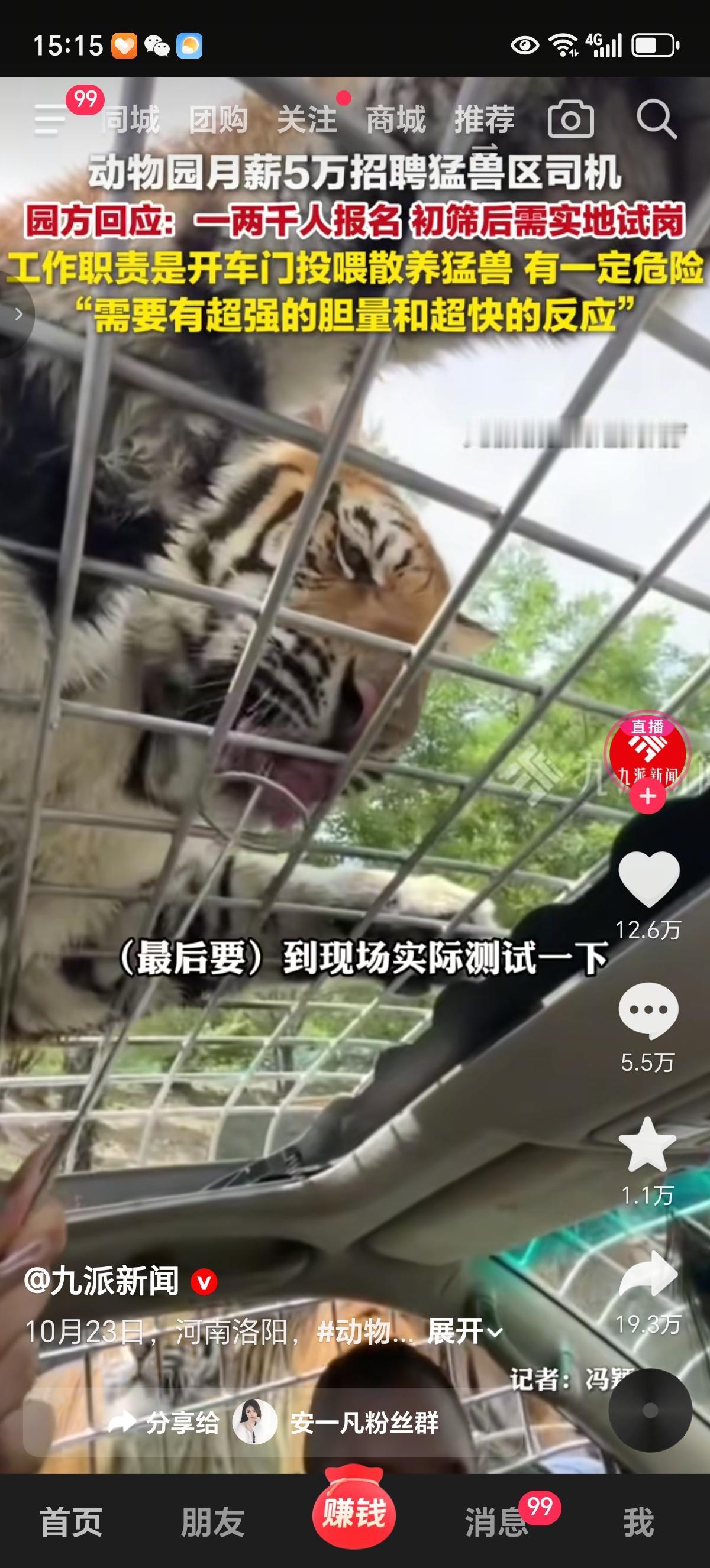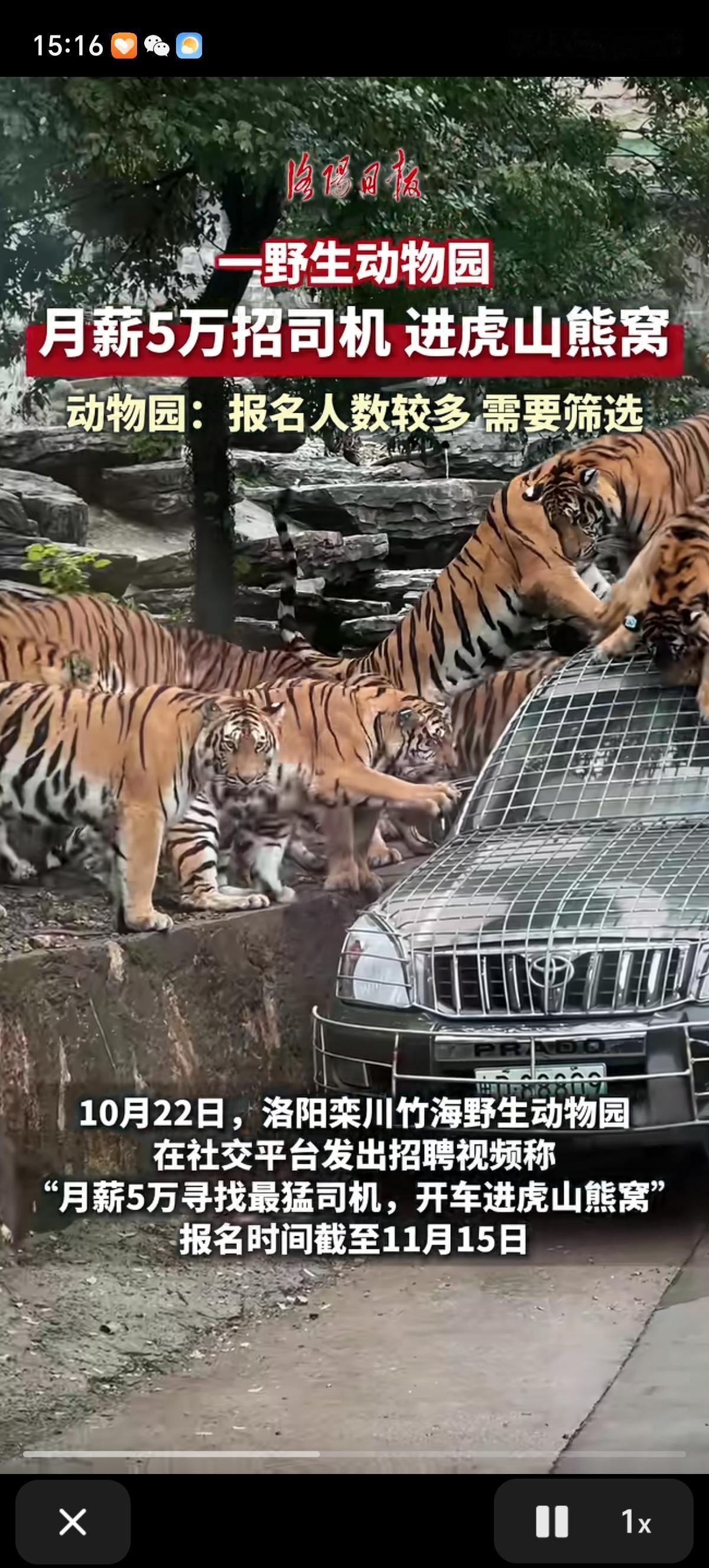 野生动物园高薪招司机,月薪5万,要求不低,要有胆量和反应速度,个人觉得会点驯兽技巧逃跑技能更好。 近日,某野生动物园发布司机招聘启事,月薪5万元的高薪,岗位主要负责园区内游客接驳、动物饲料运输等工作,并非传统意义上的普通司机。 招聘要求明确,需持A1或A2驾照,有5年以上大型客车或货车驾驶经验,且无重大交通事故记录。因需近距离接触动物,还要求具备基础动物习性认知,能应对突发情况,比如遇到动物靠近车辆时的正确处置。 此外,该岗位工作强度不小,需适应早6点至晚8点的弹性工时,每月仅休4天,且需住在园区宿舍。负责人表示,高薪是对驾驶技术、应急能力和工作时长的综合补偿,目前已有近百人投递简历,筛选重点将放在驾驶安全记录和应急反应测试上。