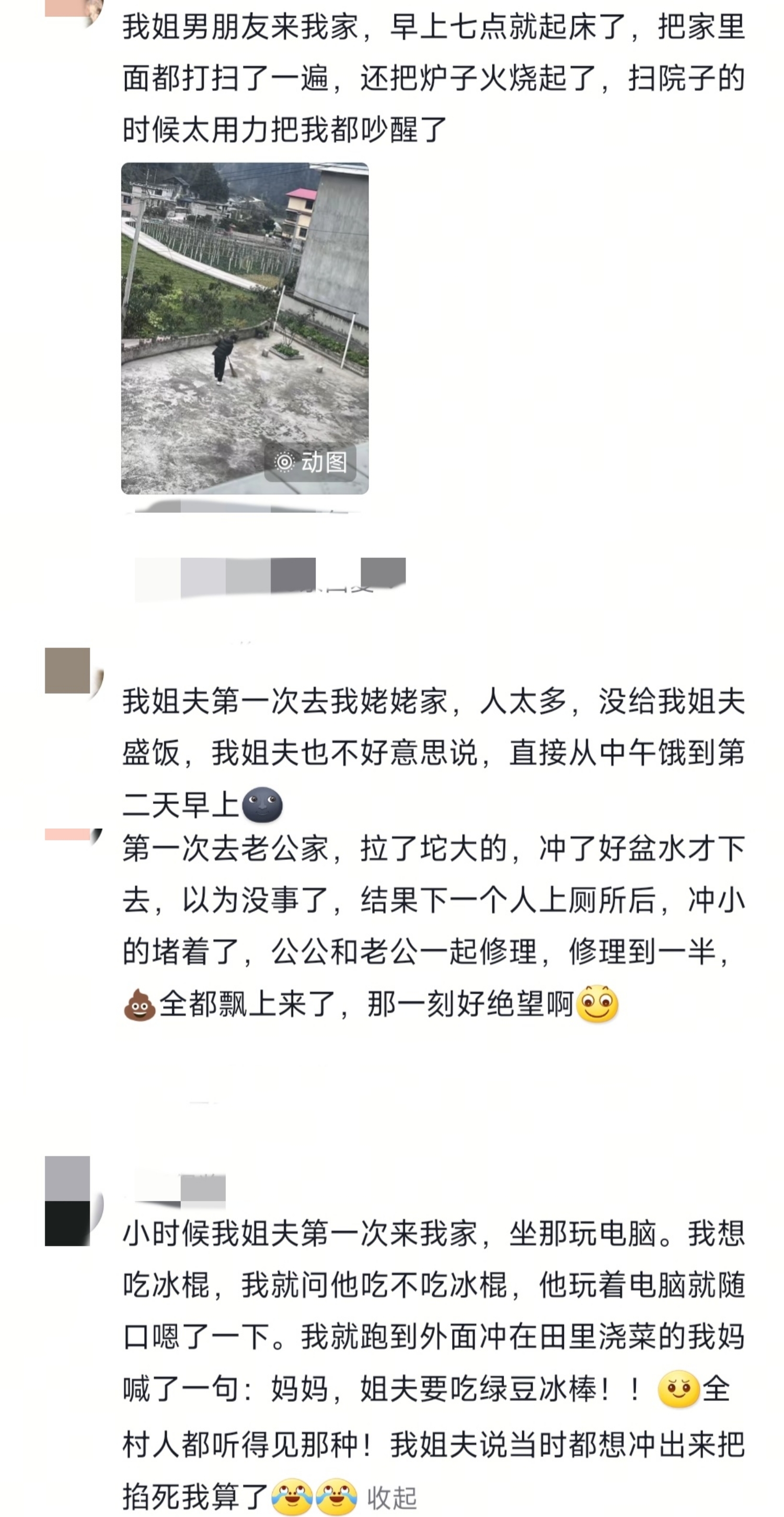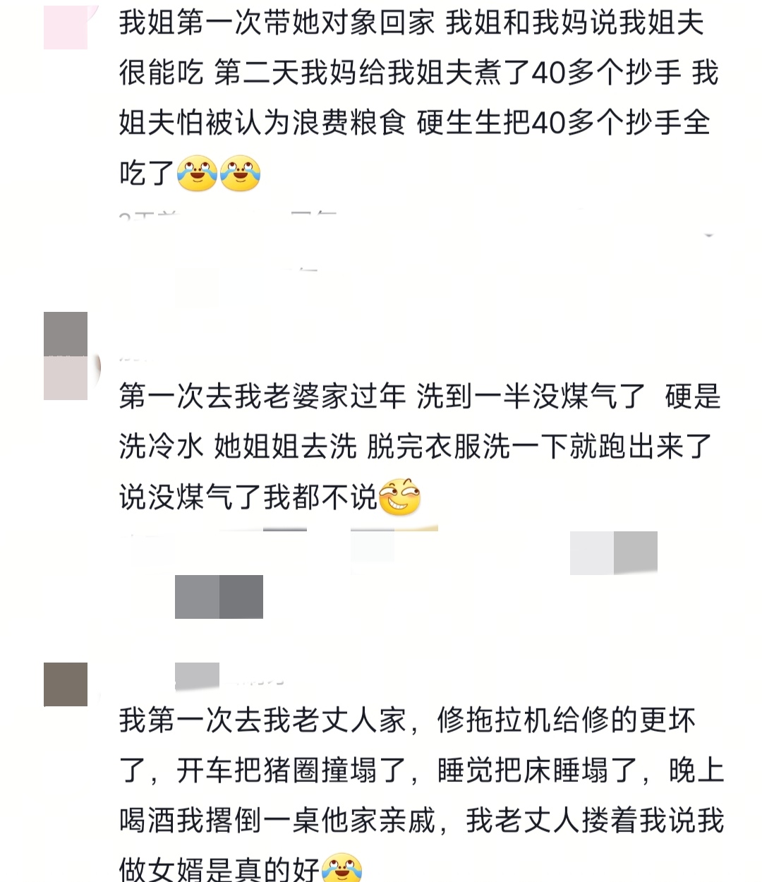我姐夫第一次去我姥姥家,人太多,没给我姐夫盛饭,我姐夫也不好意思说,直接从中午饿到第二天早上。