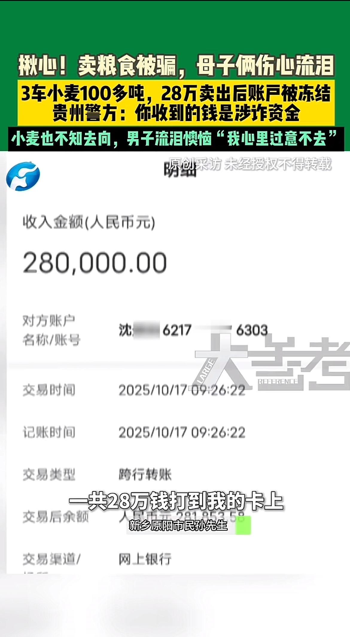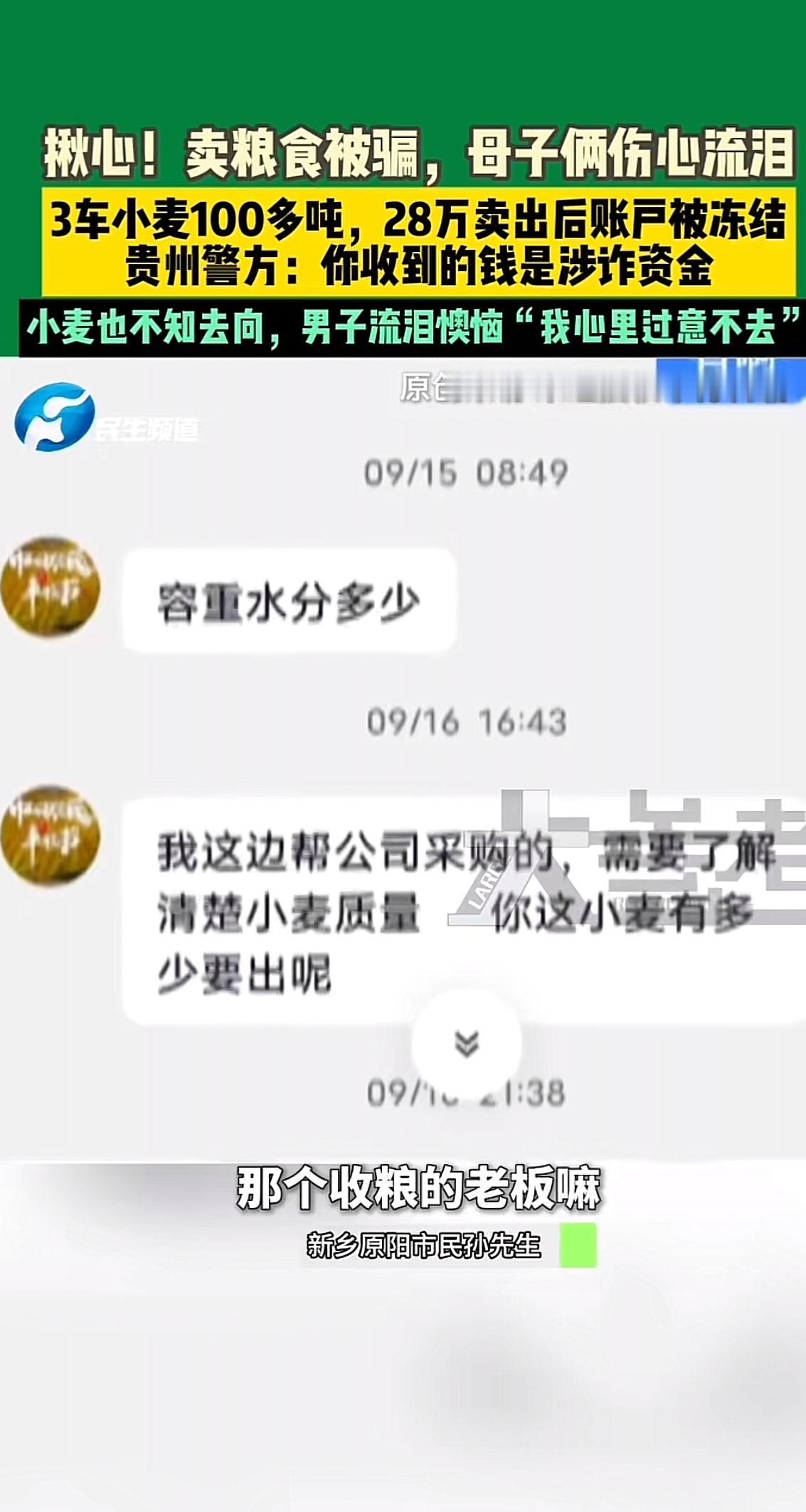 卖粮被骗28万,这对母子得多绝望啊!海报新闻报道,3车100多吨小麦卖了28万,钱到账账户却被冻结。就像之前奈曼旗的案例,李某以赊购方式骗了6户农民28万余元粮款。他承诺高价收购,先收货过几天付款,结果转卖玉米后就跑路。农民一年到头辛苦种粮,就盼着卖个好价钱,这一下被骗,一年的心血全没了。希望警方赶紧破案,让骗子受到惩罚,也提醒卖粮的朋友们,交易时一定要提高警惕,别让自己的血汗钱打水漂。