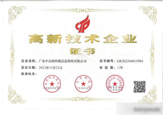 ▲2022年,中山网通过“广东省高新技术企业”认定