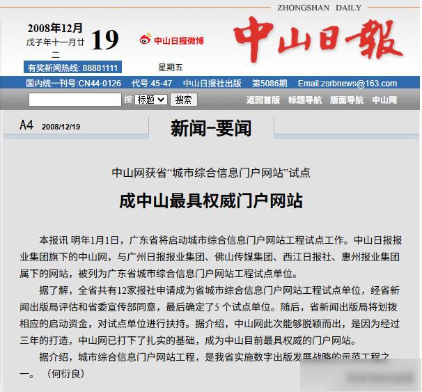 ▲2008年,中山网获省“城市综合信息门户网站”试点