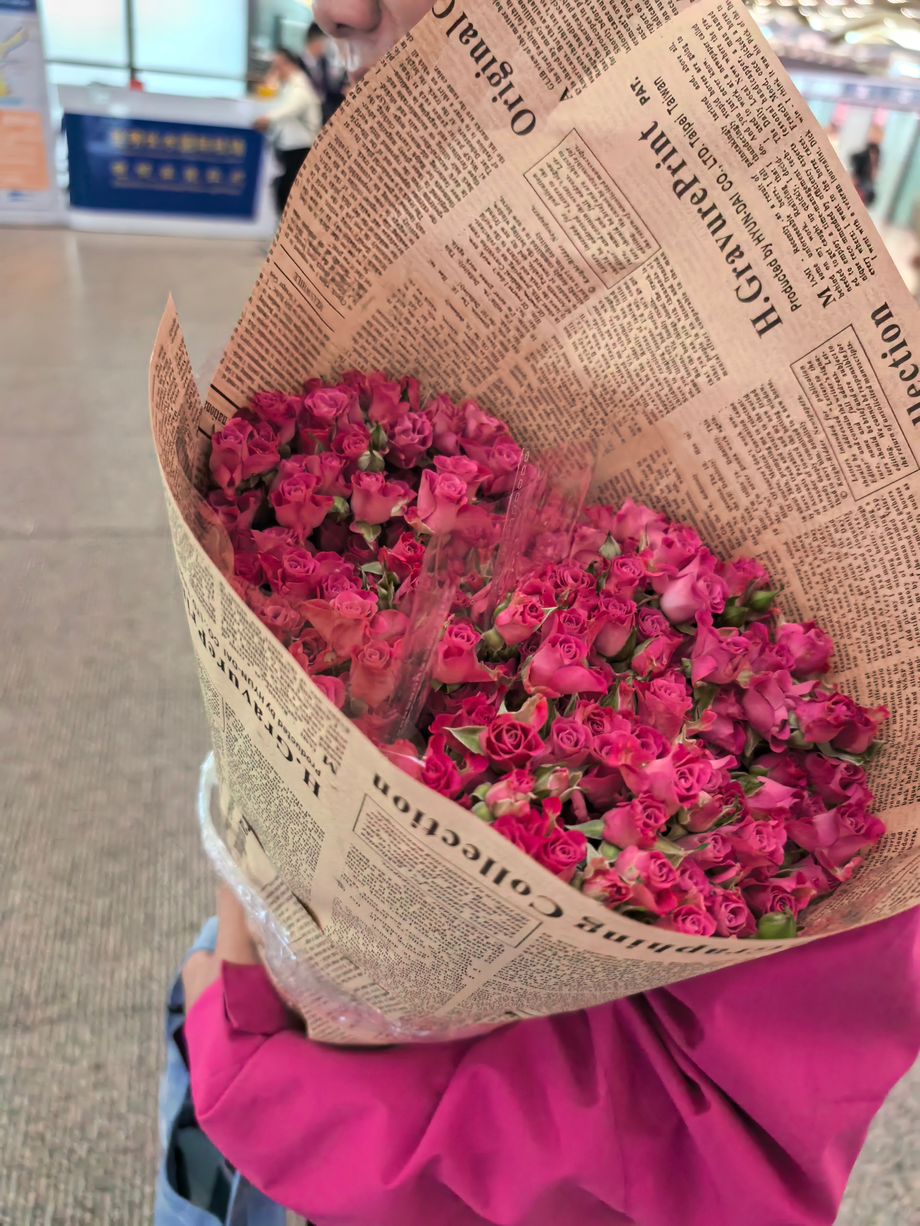 没结婚的小伙子就是不一样,坐三个小时飞机也要给女朋友捎束鲜花。[哈哈]