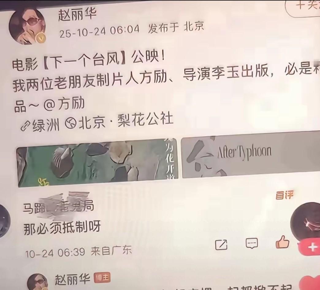 方励“骂人”风波刚平息,竟又迎来“神助攻”? 此前,导演方励因争议言论引发热议,尽管已删除相关发言,但《深海》票房受到冲击,排片接连减少。就在事件逐渐平息时,作家赵丽华却突然“补刀”,在社交平台发布一则耐人寻味的博文,还伴有对网民的讥讽语气。 此举迅速点燃舆论,再次将方励和李玉推上风口浪尖。评论区炸锅,数千网友围观点评,矛头直指赵丽华的言论。而《下一个台风》即将公映之际,这场舆论风波无疑让影片再添许多变数。 敏感时期的每一个动作,都会成为大众关注点。负面舆论如同“蝴蝶效应”,这出戏究竟会如何收场,仍待时间给出答案