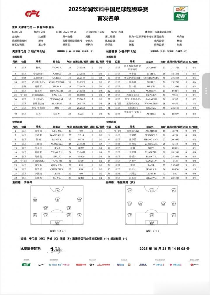 直播吧10月25日讯北京时间15:30,中超第28轮,天津津门虎vs长春亚泰,赛前官方公布首发阵容。