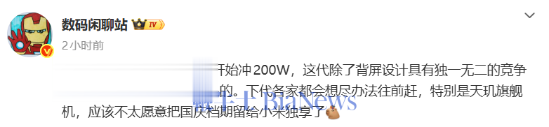 10月25日,博主“数码闲聊站”发文称,“小米17系列实时激活销量开始冲200W,这代除了背屏设计具有独一无二的竞争力外,档期优势还是很明显的。下代各家都会想尽办法往前赶,特别是天玑旗舰机,应该不太愿意把国庆档期留给小米独享了。”