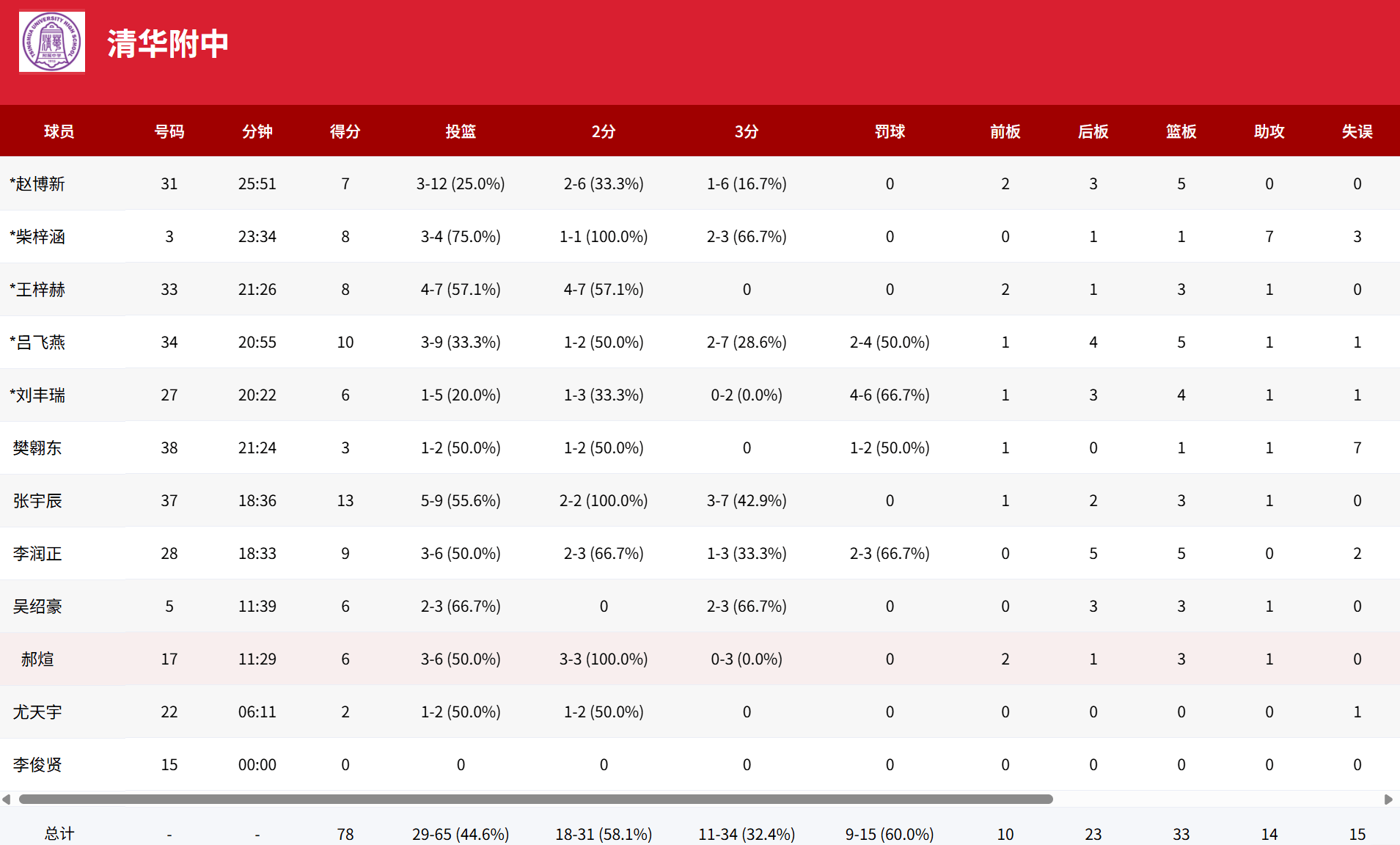 清华附中:张宇辰13分、吕飞燕10分、李润正9分
