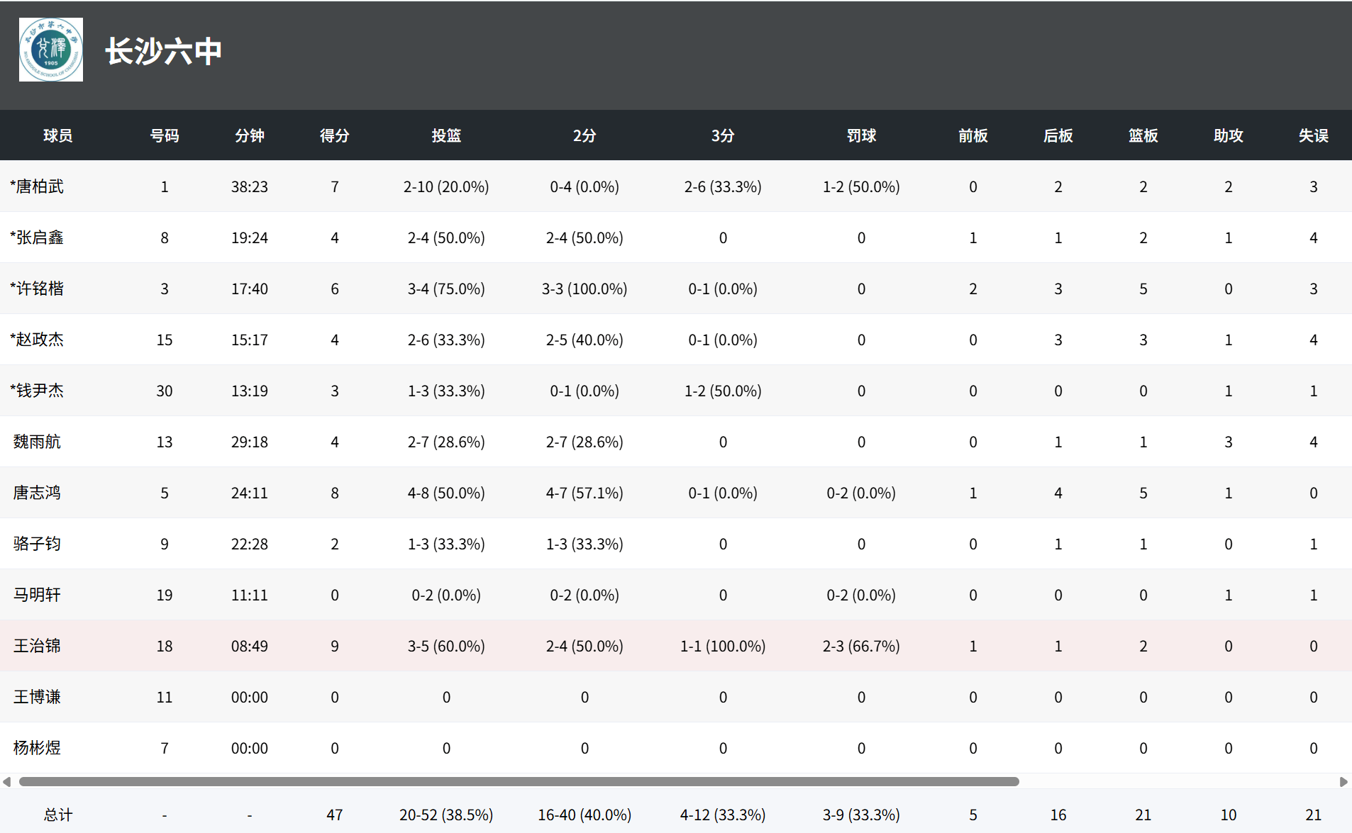 长沙六中:王治锦9分、唐志鸿8分、唐柏武7分