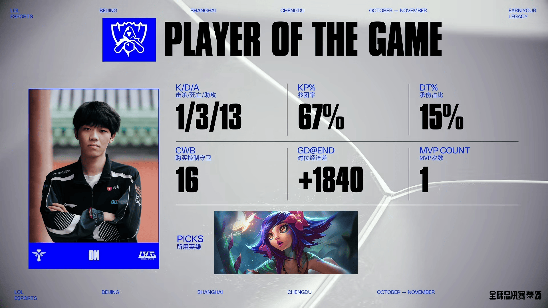 虎扑10月25日讯在刚刚结束的S15瑞士轮的比赛中,ON妮蔻砍下1/3/13的战绩,拿下BLG对阵TES首局MVP