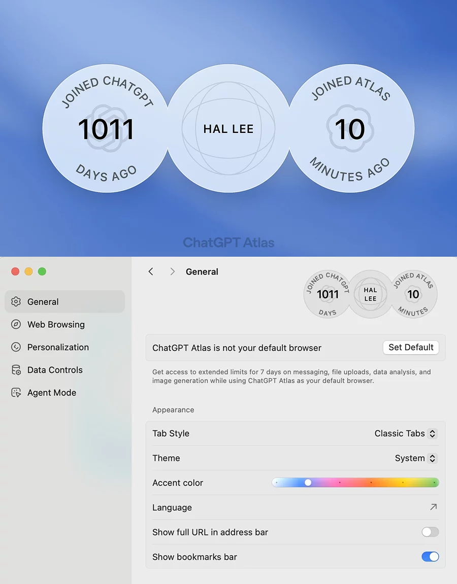 为什么一个简单的天数统计,能让人产生分享冲动?背后藏着什么设计心机?在ChatGPTAtlas浏览器的产品设置界面中,设计师并没有遵循传统布局。界面的右上角放置了一个非常规的、由三个交叠圆环组成的视觉元素,像一枚数字徽章或贴纸。这个小小的贴纸,将用户与产品两个关键的时间节点——一个是长达近三年的忠诚陪伴,一个是刚刚开启的全新探索——并置在一起,形成强烈的情感和时间对比。它满足了用户的「资历认同」心理。
