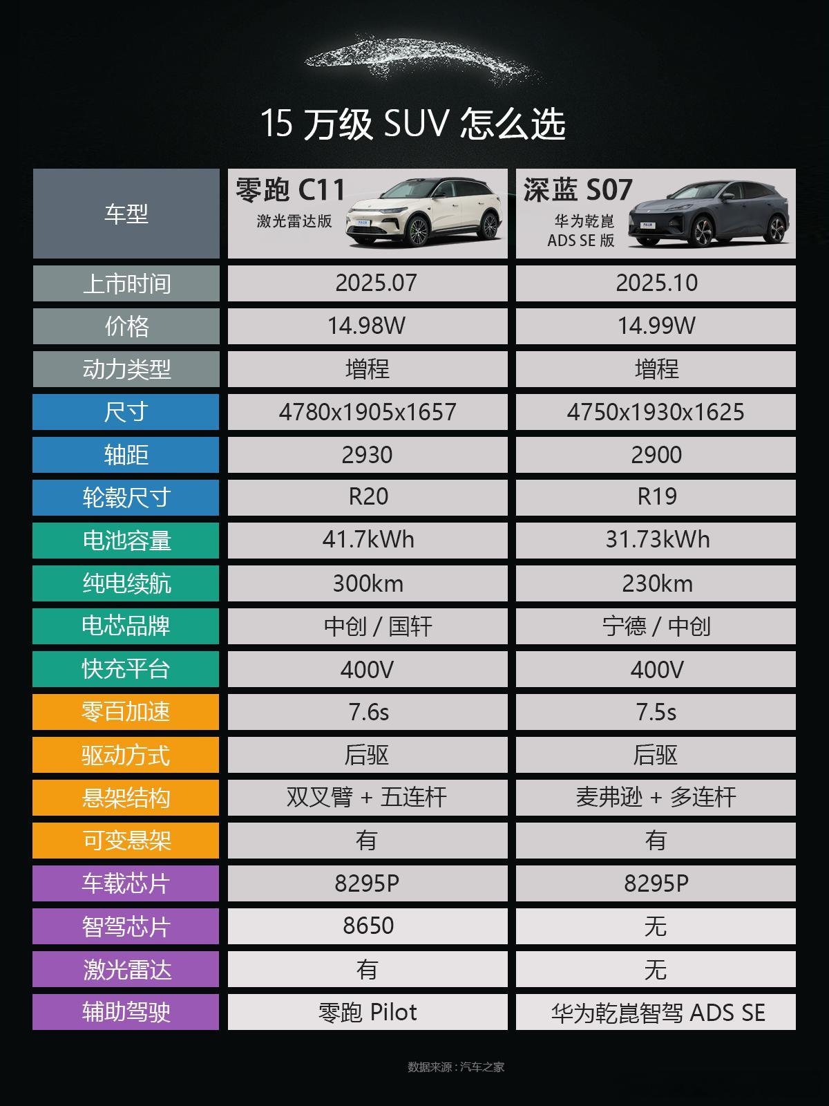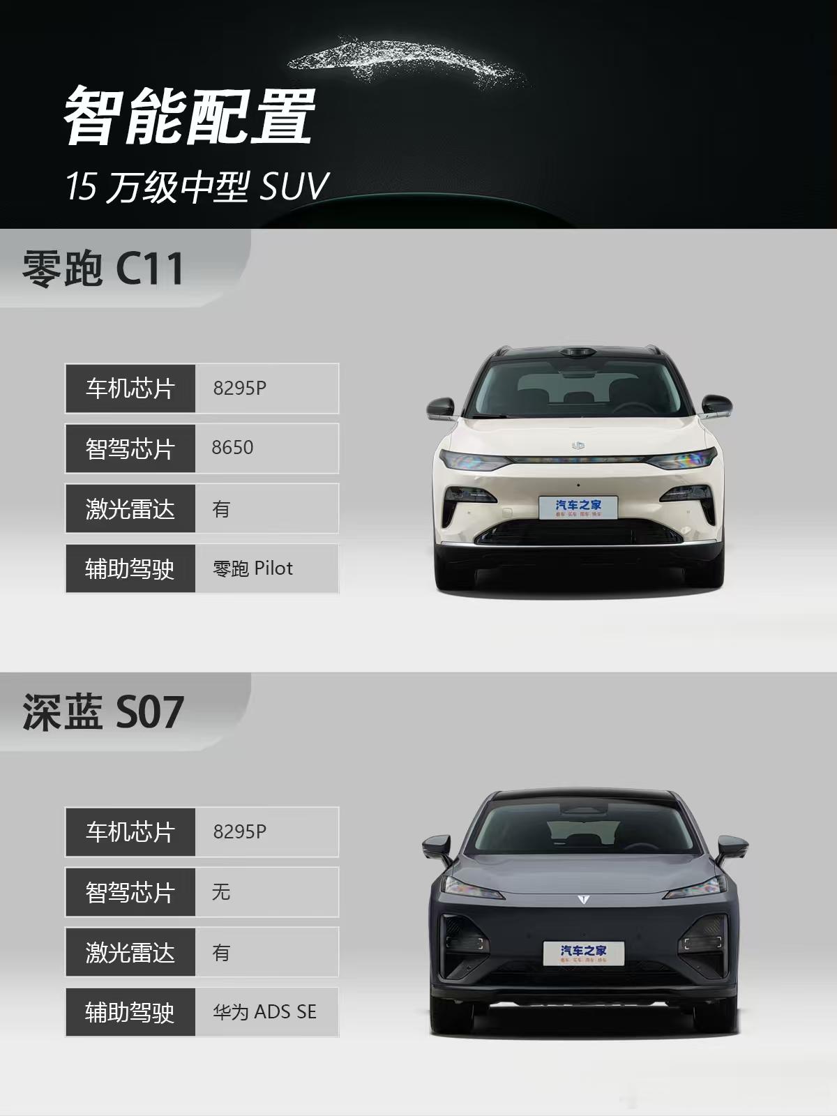 关键发现:深蓝S07的"华为乾崑ADS SE版"并非搭载激光雷达的高配版本,而是纯视觉智驾方案。零跑C11在硬件配置上明显领先,配备激光雷达+独立智驾芯片。