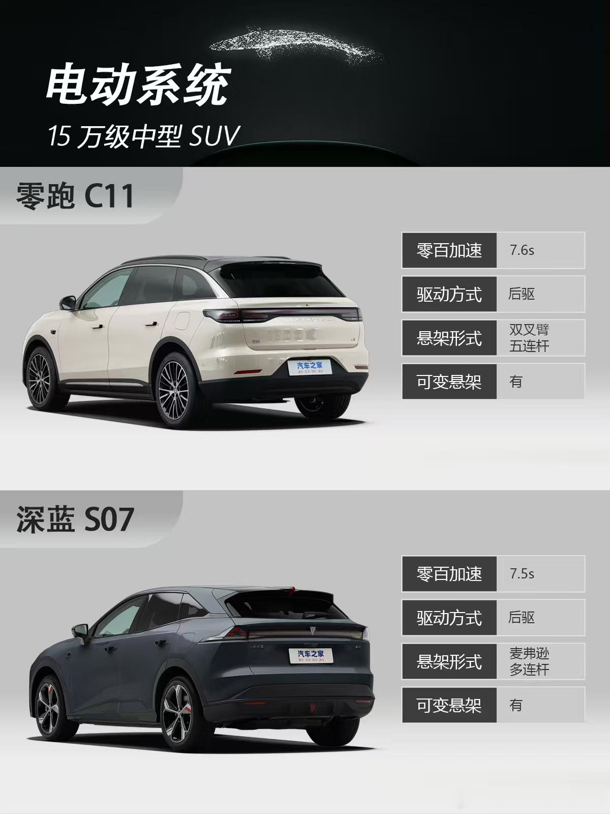 结论:零跑C11轴距长30mm,后排空间更宽敞;前悬架采用成本更高的双叉臂结构,操控性更好。
