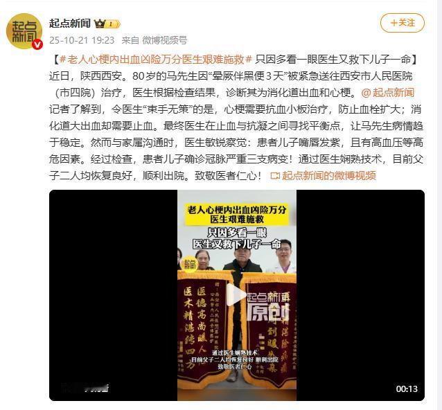 “这个医生火了!”近日在陕西西安,一男子陪同80岁老父亲去医院看病,结果被医生看了一眼就诊断出冠脉严重病变。就看一眼的这个医生莫非是神医? 俗话说得好:“人这一辈子,最怕的不是生病,而是明明病了还不知道。” 现在的生活节奏快,很多人把身体当成“铁打的”,忙起来三餐不规律、熬夜成常态,觉得小毛病撑一撑就过去了,可健康这东西,从来不和谁讲情面。 这不,最近陕西西安的一位医生,就因为“多看了一眼”,硬生生救下两条命。 一天清晨,80岁老人被儿子搀进医院,脸色惨白、步伐虚弱。 医生问诊后得知,老人已经连续三天拉黑便,还出现晕厥。 经过一系列检查,结果让人倒吸一口凉气,老人竟同时患上消化道出血和急性心肌梗死,而这两种病一起出现,就像火上浇油,治疗起来也是相当的棘手。 因为心梗要靠抗血小板药物防血栓,但这种药又可能让出血更严重,可止血药一用,心脏那边又可能堵得更厉害,所以医生就像在钢丝上走路,一边是出血风险,一边是心梗复发,稍有不慎就是万劫不复。 好在这位医生经验老到,通过精准调整药量,能够做到让老人的病情稳定下来。 而就在家属可算是松了口气的时候,医生忽然注意到,老人的儿子嘴唇有些发紫、面色偏暗,别人也许不在意,可医生立刻意识到,这大概率不是个好兆头。 于是医生就随口问了一句,“你平时有没有胸闷、气短?” 男子憨厚的一笑表示都挺好的,就是偶尔血压高点,可医生却不这么认为,并坚持建议他做个心脏检查,毕竟医生也是希望是自己多虑了。 但医生说了最好检查一下,这男子也是听话,就去做了检查,可结果一出,全场愣住,男子竟然真的患上了冠状动脉三支严重病变,情况十分危险。 得知消息的医生也感叹,如果再晚发现一个月,那后果可能更加不堪设想。 这场本来是由男子“陪父看病反而被救”的离奇插曲,却也是救了一个家庭。 而这个医生的专业程度,也让无数网友感慨这真是一个好医生,同时也开始反思,究竟还有多少人,身体也藏着这样的“定时炸弹”呢? 其实,在生活中这样的“奇迹”也并不罕见,也有其他的人们得益于专业医生的良好医德,从而在情况严重之前得到了指点。 就比如前几年,江苏南京一位妈妈带孩子打疫苗,医生就发现她脸色发黄,于是就坚持让她查肝功能,结果查出急性重症肝炎,再拖几天可能就得换肝。 还有在广东佛山的一位出租车司机,医生上车时无意间看到他手指发青,提醒他去体检,虽然司机不信,但第二天突然的心梗发作,却因为确实心里早有准备,所以及时的捡回了一条命。 也就是这些生活中看似偶然的多看一眼,却成了“救命一眼”。 而这也是医生经验积累的一种最好体现,就像有时候的老医生会常说,机器看结果,眼睛看人,真正的有经验的老医生,他们能从颜色、气息、动作里察觉问题。 这样的话听起来有点儿神奇,但却也是他们多年与生死打交道练出来的“本领”。 所以西安这位医生的“火眼金睛”,也是着实让人佩服与尊敬,却也更让人警醒。 毕竟健康从来不是嘴上说说,而是要切实的真重视,有时候别看身体现在不疼不痒,那只是病还没到要闹情绪的时候,可一旦到了时候那后果也是难以估量的。 就像这位陕西医生,靠着医者仁心与看得多一点、想得深一点,就能多救一条命。 而人这一生,谁都逃不过生老病死,但能不能避开意外,全看你愿不愿意提前留意,就像上面提到的那位男子,本来是去救父亲的,结果医生顺手也救了他。 在生活中也别再说“忙没时间体检”,也别再逞强或是为了省钱而撑着去拼命,就像健康这事,说白了是需要花时间保命的一次隐形买卖。 身体不会骗人,忽视才最为致命,而天底下最贵的药,永远都是“后悔”这种买不到的药,而最好的医生,也不只是在医院,反而是那个学会倾听身体的你自己。 (信源:《老人心梗内出血凶险万分医生艰难施救,只因多看一眼,医生又救下儿子一命》起点新闻)