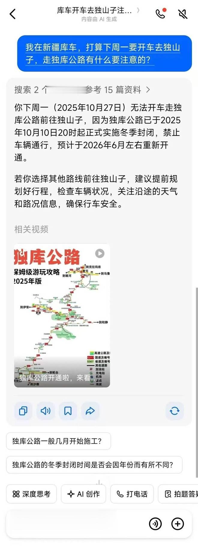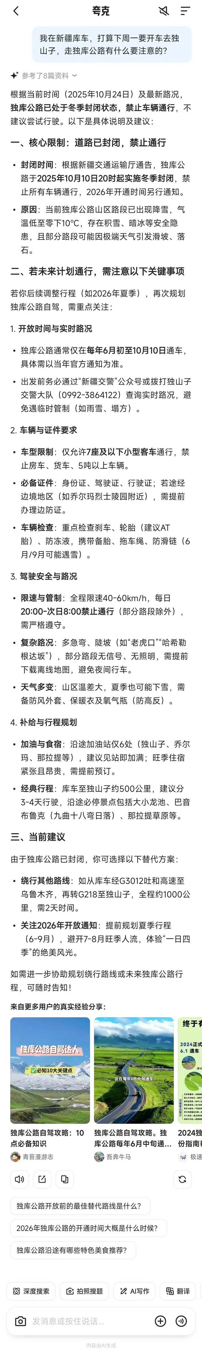 两者都明确指出了目的地已无法通行,但夸克额外给出了未来出行的注意事项及绕行建议,多考虑了两个层级。