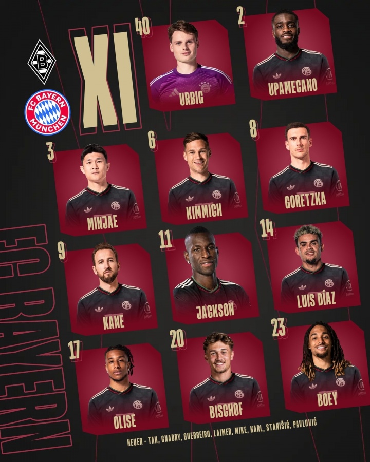 直播吧10月25日讯北京时间今日21点30,德甲第8轮,拜仁客战门兴,赛前首发出炉。