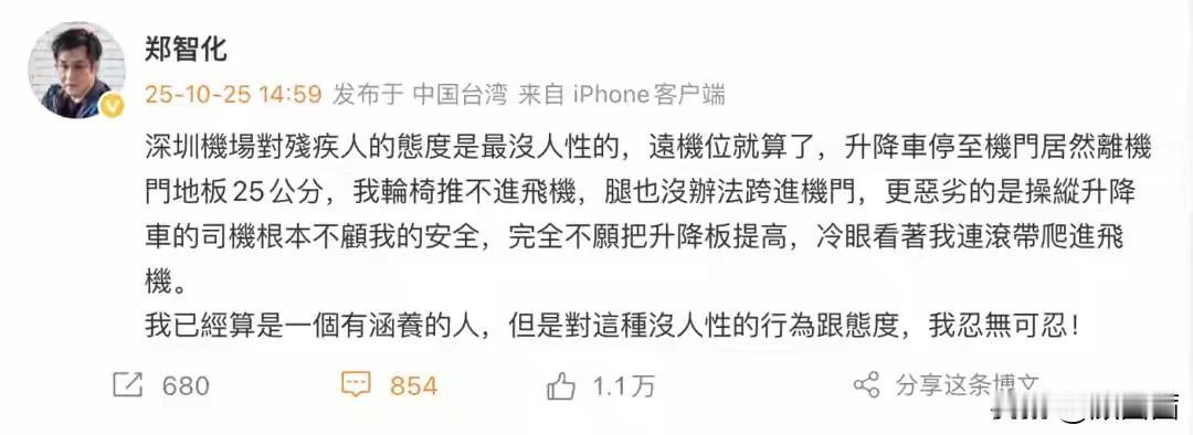 郑智化控诉深圳机场后,官方致歉了! 10月25日下午,唱着《水手》《星星点灯》的歌手郑智化,在微博上发了段让人看着揪心的话,直接把深圳机场推到了大家眼前。他说自己在深圳机场登机时,遇上了特别窝火的事儿:不仅被安排在了远机位,负责接送的升降车还没停好,离机门地板整整差了25公分。 这25公分的高度,对普通人来说不算啥,但对坐轮椅的郑智化来说就是道坎。轮椅推不进机舱,自己的腿又没法跨过这个高度,最让人难受的是,操纵升降车的司机压根不管他的安全,不肯把升降板调高一点,就冷冷看着他连滚带爬地进了飞机。郑智化说自己算有涵养的人,但这种行为实在忍无可忍,直言机场对残疾人的态度"最没人性"。 这条微博很快就引发了关注,到了傍晚,深圳机场就在郑智化的微博评论区回应了。官方说已经关注到情况,对带来的不便和困扰深表歉意,还提到已经和航空公司一起启动了核查,会借着这件事全面检查优化特殊旅客的服务保障细节,确保大家能顺畅出行。 其实这些年,咱们对特殊旅客的出行保障越来越重视了。民航局之前还专门发布过《运输机场旅客航站区无障碍环境规划建设指南》,里面特意提到要关注残疾人、老年人这些旅客的需求,从抵达机场到登机的全流程都得消除服务断点,像登机时的高差问题,本来就该有对应的解决方案 。而且不少机场也有成熟的做法,比如提前电话确认需求、提供"一站式"送机服务,连轮椅的细节都有专门培训 。 这次郑智化遇到的问题,说到底可能就是把规范落到实处时出了偏差。25公分的高差不算小,只要司机稍微调整一下升降板高度就能解决,可偏偏卡在了最该灵活处理的环节。有网友说提前申请服务会更顺畅,但也有人觉得,这种基本的保障不该只靠旅客主动申请,机场本就该提前考虑到。 现在机场已经致歉并启动核查,这是个好的开始。但大家更关心的是,这次之后,特殊旅客的保障会不会真的变实在。毕竟无障碍环境建设不只是装设备、定规范,更要看一线服务有没有温度,能不能真正帮到有需要的人。 你有没有在出行时见过特殊旅客遇到困难?你觉得机场该从哪些细节改进,才能让特殊旅客的出行更安心?欢迎在评论区聊聊你的看法。