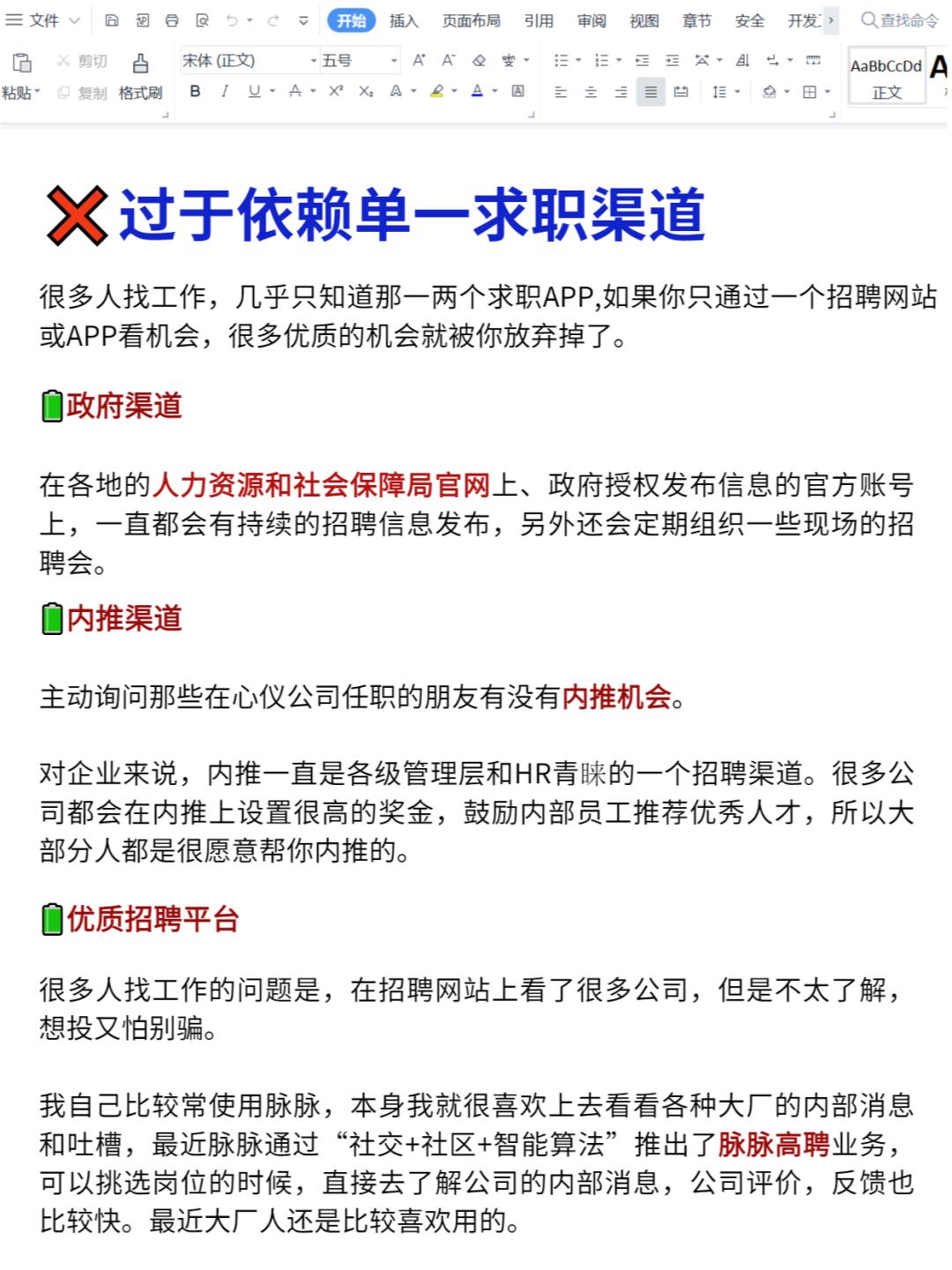 ⭐一般来说,我更推荐这3个渠道:政府官方发布的招聘信息、内推以及小众优质的中高端招聘渠道。比如脉脉推出脉脉高聘业务,大厂人都很喜欢!